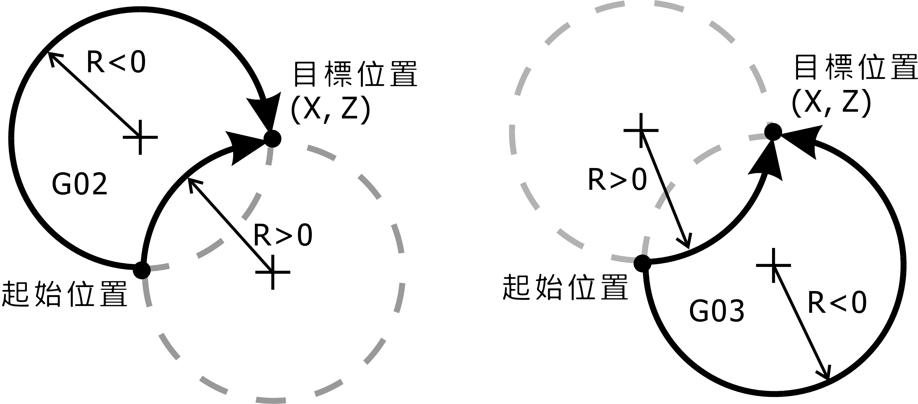 正常狀態:在圓弧插值指令中,若有 R_ 值出現,將優先被視為以此方式處理。指令中 X_Y_Z_ 是指目的地,R_ 表示半徑。當 R_ 是負值時,該圓弧將大於 180 度。