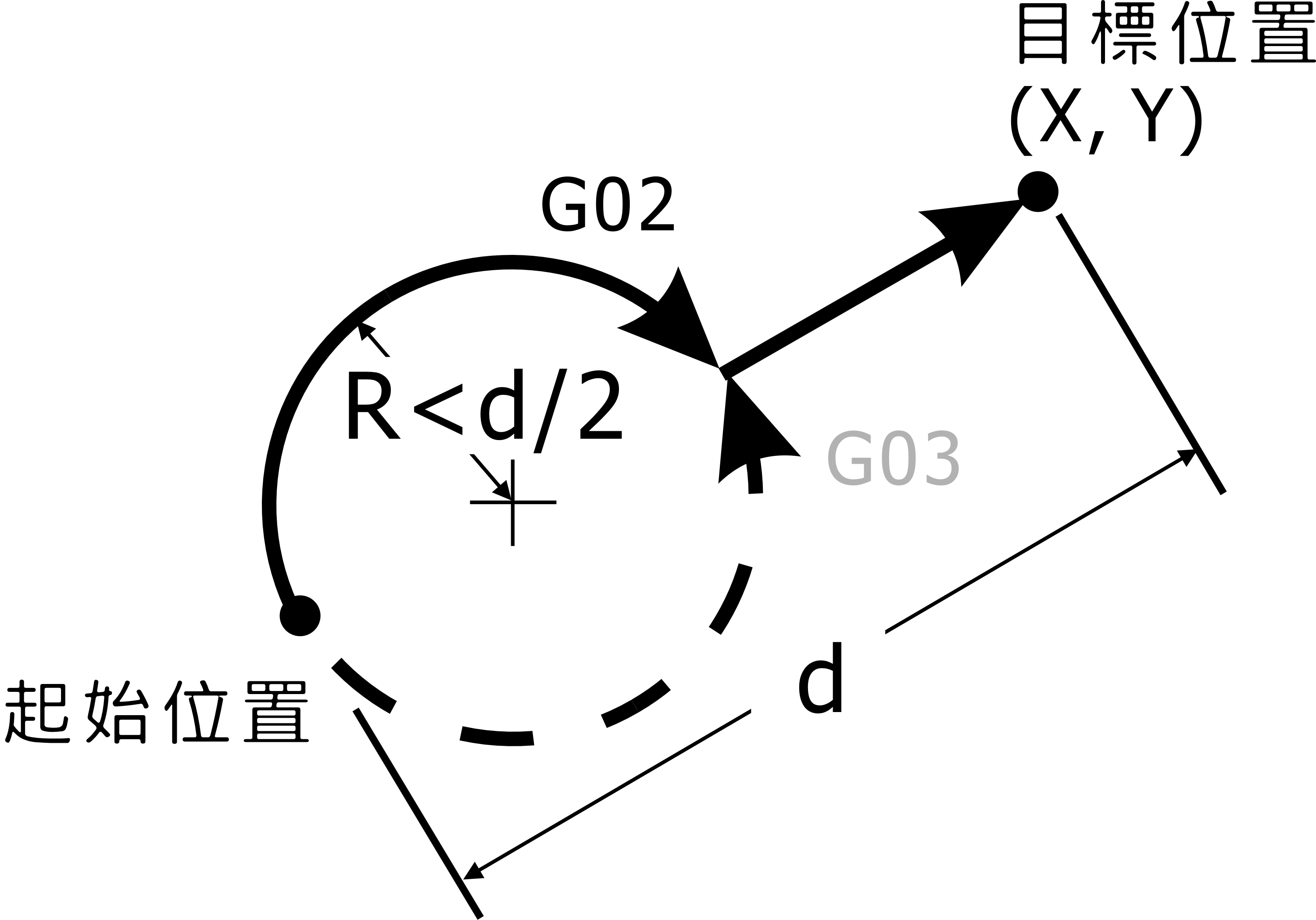 若d > 2R:若 R_ 值小於至目的地行程的一半時,將先走以 R_ 值為半徑的半圓,然後再以直線走到目的地。而此圓弧指令模式,仍繼續保留有效。