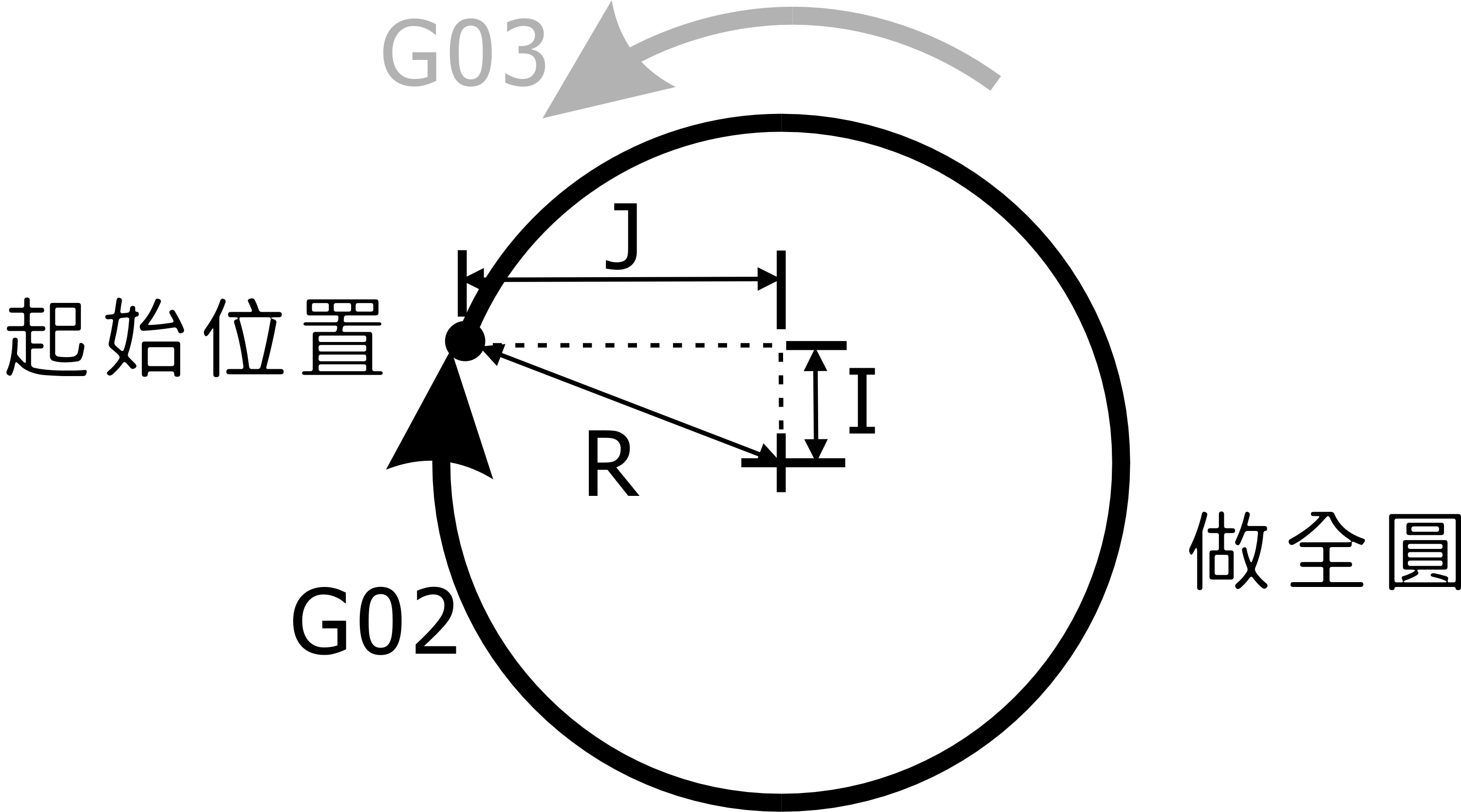 若目的地 X_Y_, X_Z_, Y_Z_ 沒給,則將以 I_J_, I_K_, J_K_ 為圓心做一全圓。若 G02/G03 指令中之起始點與終點相同時,執行全圓。