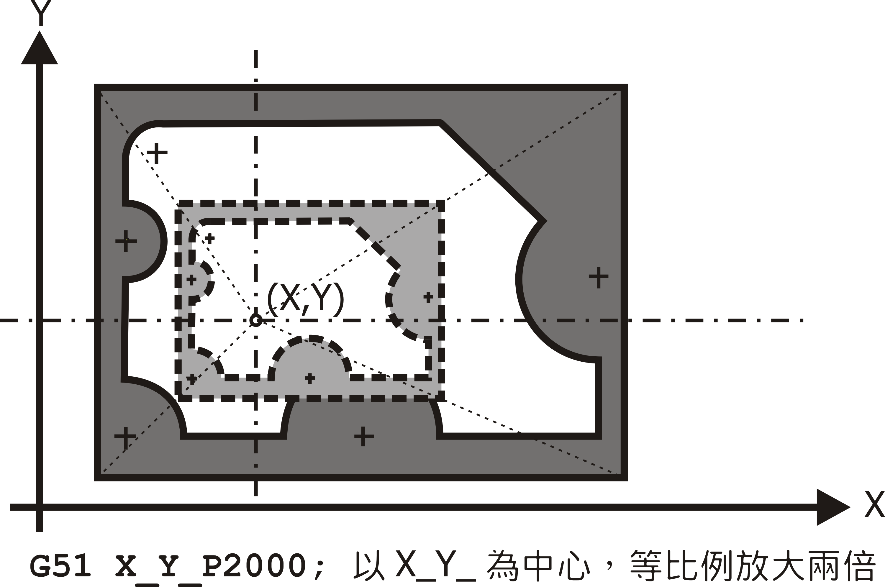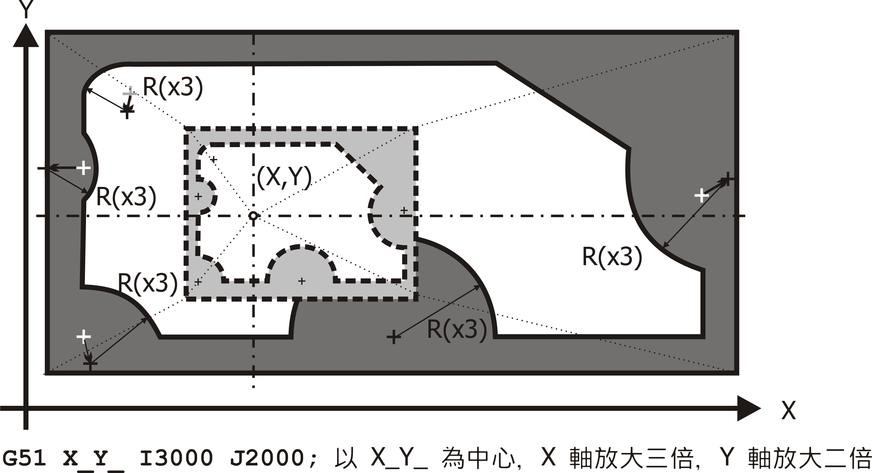 G51 指令可啟動比例與鏡像作用,此作用以 X_Y_Z_ 設定其中心點,若三軸比例相同,可以 P_ 值表示要放大或縮小的比例值。P_ 值只能為正整數值,若給負值則視為無效;若 P_ 值或 I_、J_、K_ 值無設定或設為負值,則以 "參數→放大比例" 設定之 P 值為比例值。