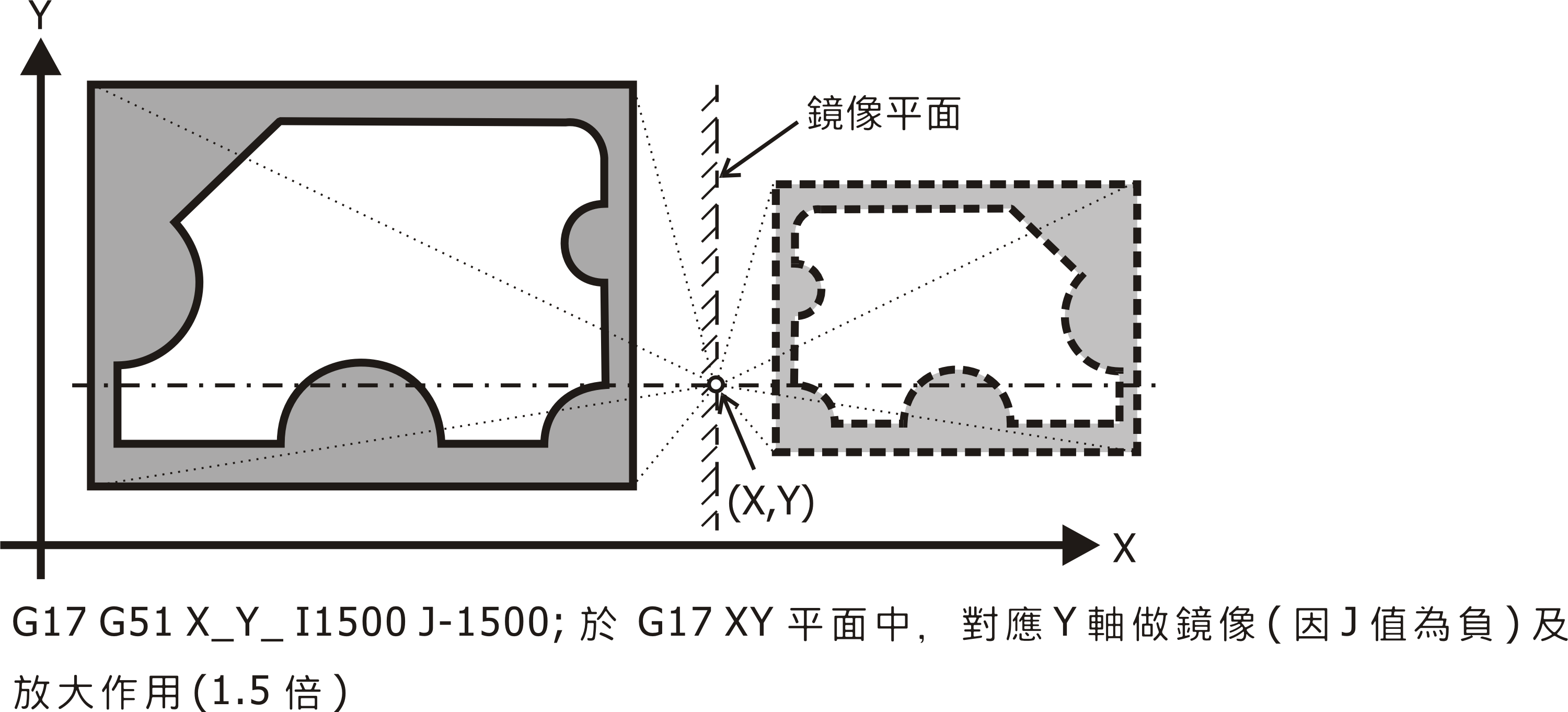 若 I_、J_ 或 K_ 是負值,則為對應於該軸之鏡像作用;此鏡像作用與平面選擇有關,依 G17/G18/G19 平面選擇決定該給 I_J_、I_K_ 或 J_K_ 等鏡像負值。若有給 I_、J_ 或 K_,但其中 I_、J_ 或 K_ 之一未給, 則將以參數預設之 "參數→放大比例→X 值(Y 值或 Z 值)" 值為各軸倍率。