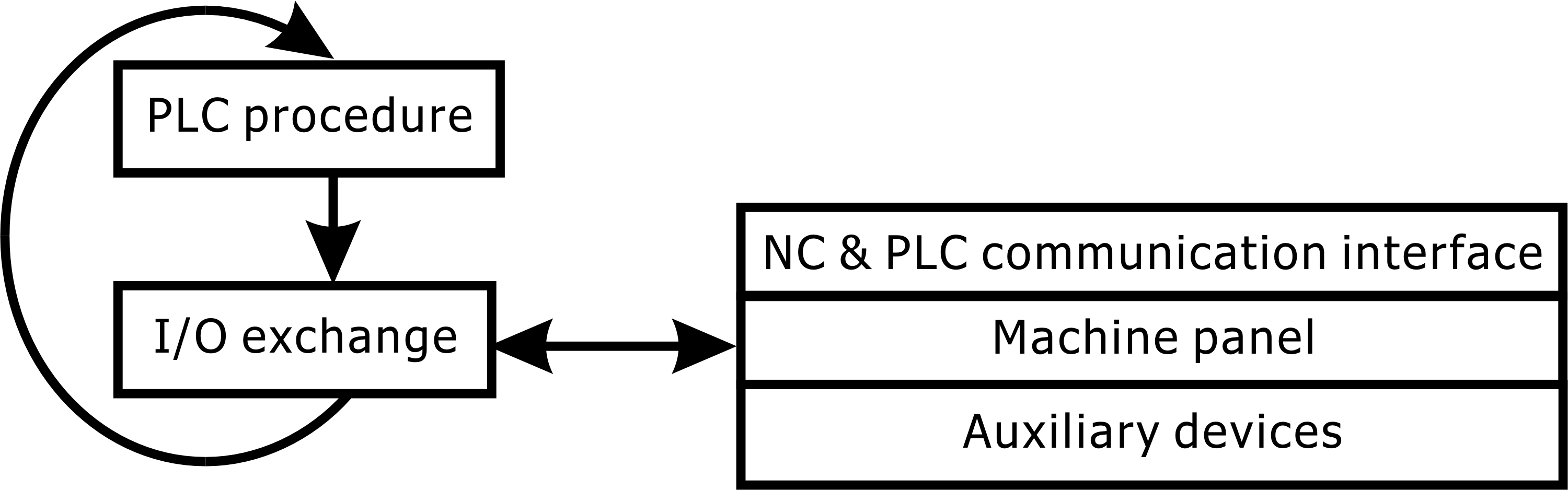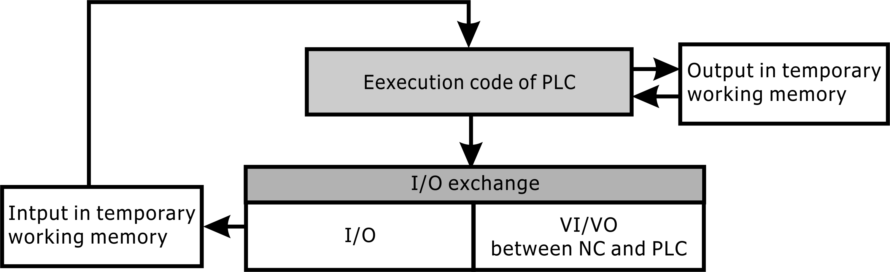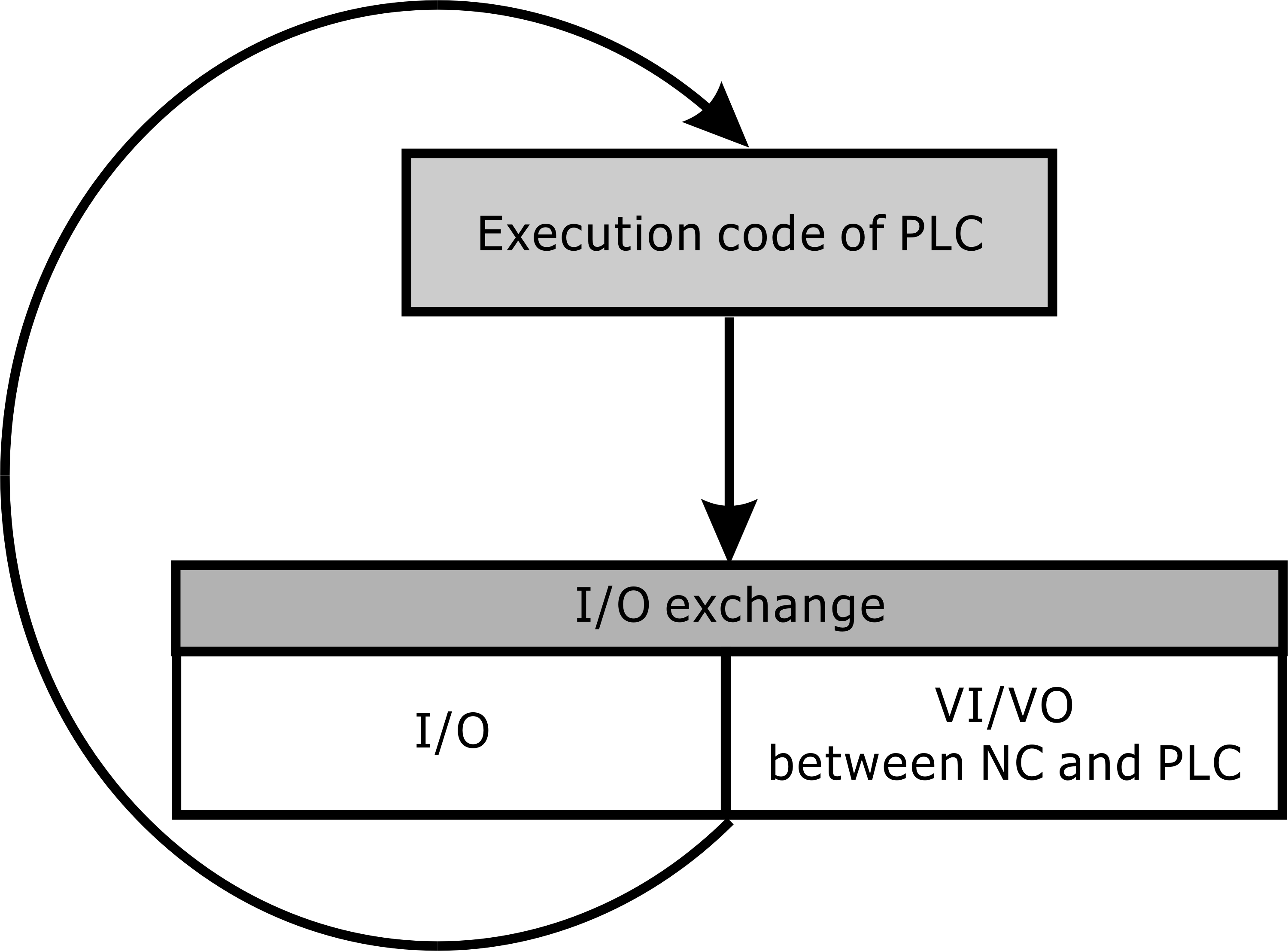 The I/O exchange section has two parts, the first is the actual I/O (input/output) and the second is the VI/VO (virtual input/virtual output) communication between the NC and the PLC. When I/O exchange is executed, physical input and virtual input will save in temp memory for next PLC cycle. A temp output memory keeps tracing PLC procedure output, and I/O exchange puts instant output to physical output and virtual output.