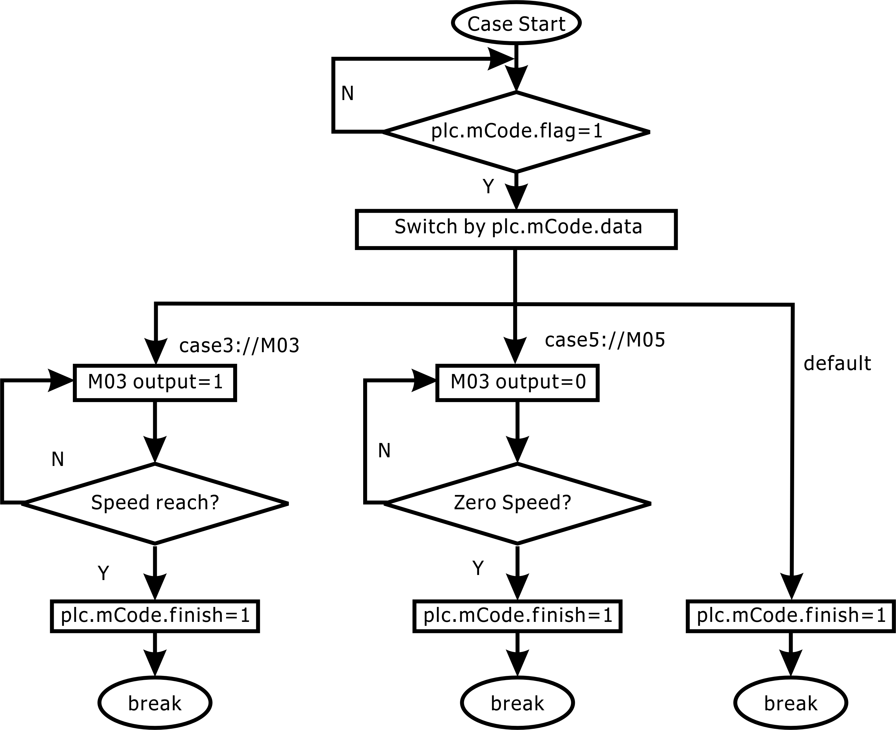 M03 event and M05 event are processed by PLC procedure. When plc.mCode.flag becomes 1, PLC reads plc.mCode.data then processes M03 or M05, if plc.mCode.data is 3, PLC turn on M03 output and waiting Speed reach signal from Inverter. After PLC received Speed reach "on" signal then sends plc.mCode.finish. If plc.mCode.data is 5, PLC turn off M03 output and waiting Zero speed signal from Inverter. After PLC received Zero Speed "on" signal then sends plc.mCode.finish.