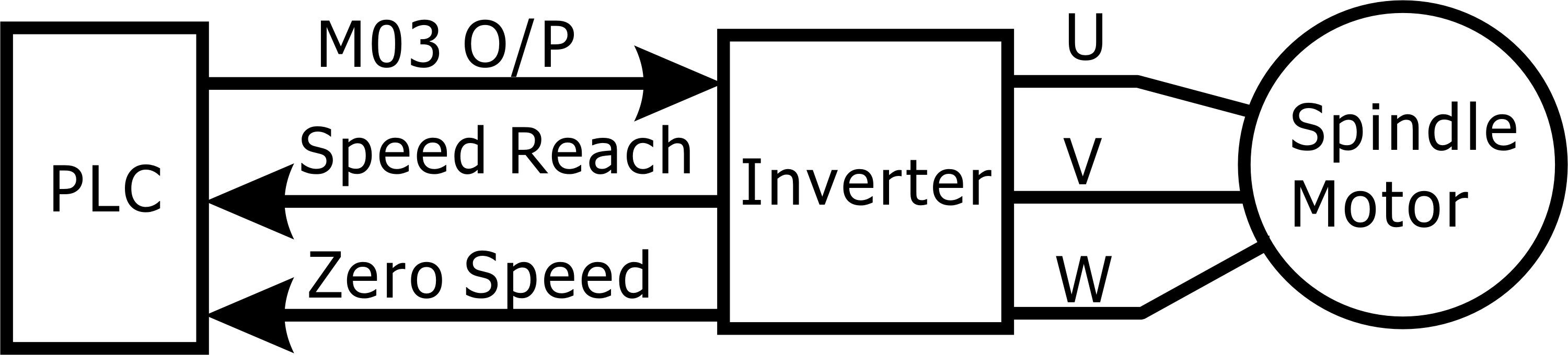 An inverter controls the spindle motor, and inverter is controlled by PLC output, inverter has two outputs for speed reach and zero speed.