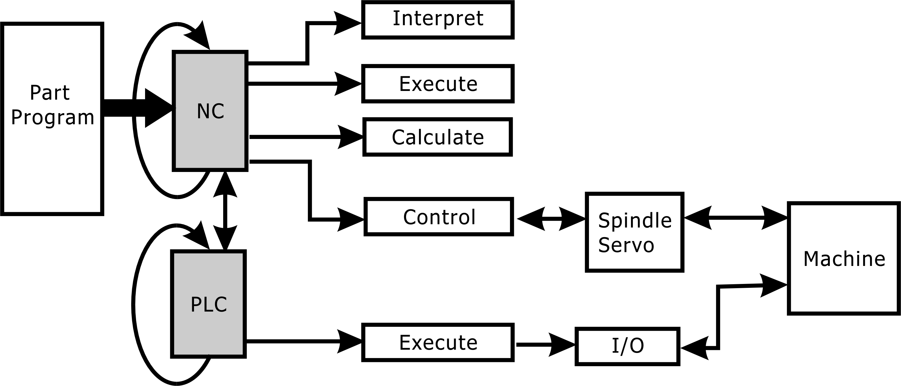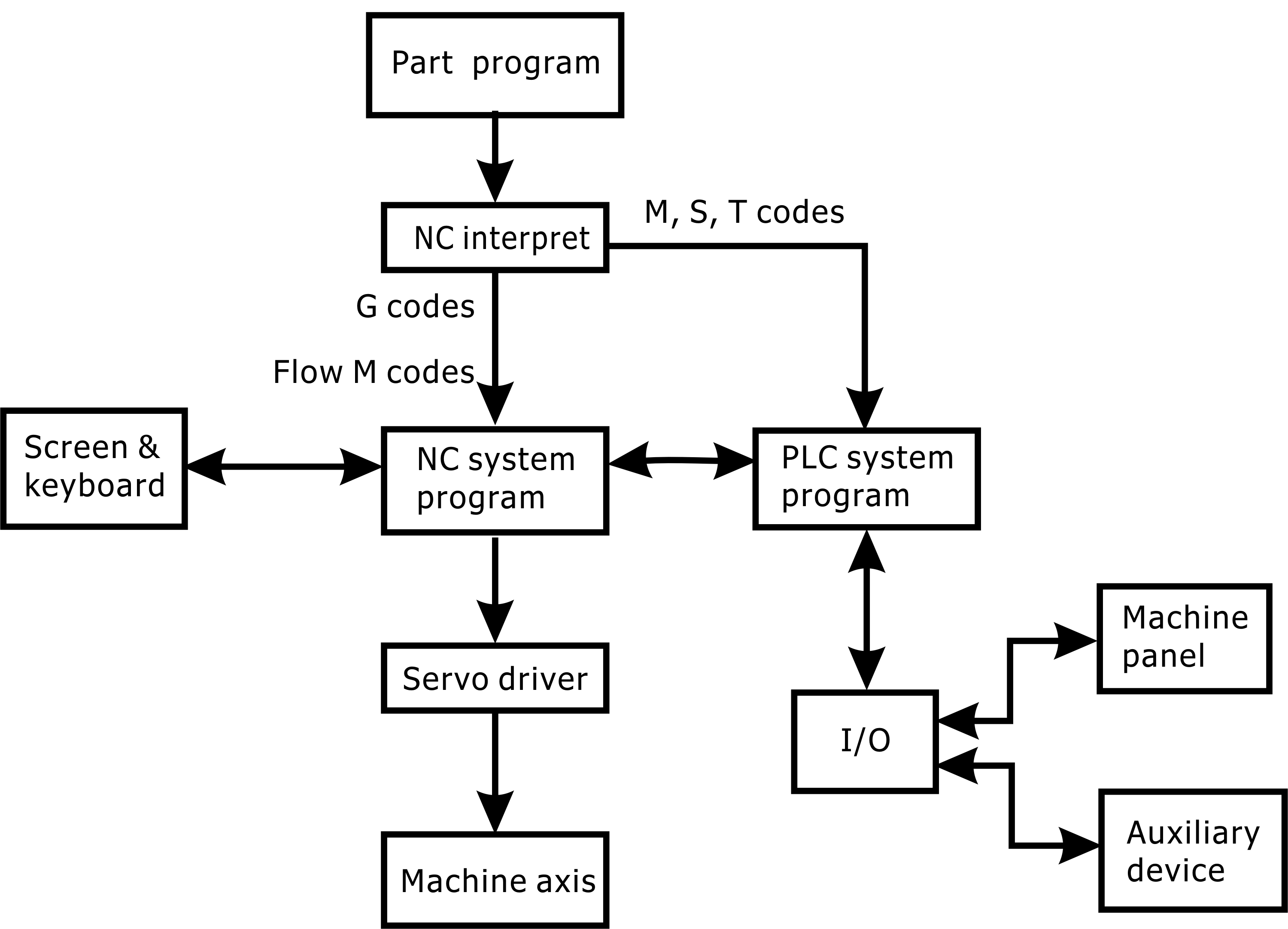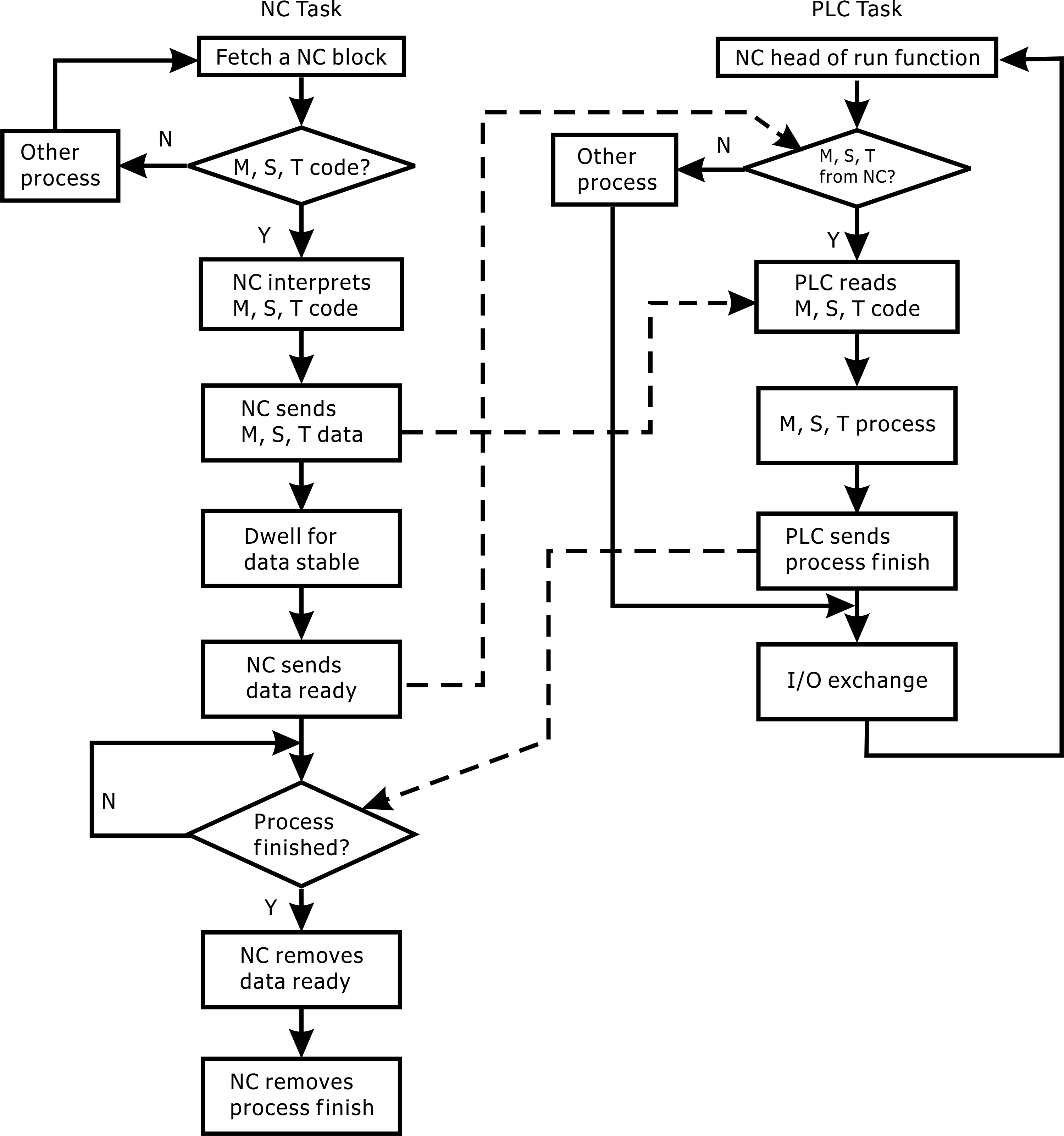 When the processing program is interpreted, NC will determine the M, S, T code processed by the PLC, and then deliver the PLC processing, waiting for the PLC reply processing completed; When the NC executes the G code, it will refer to the current state of the PLC for further processing (ex: override rate). The diagram is showing as below is flow of CNC part program.