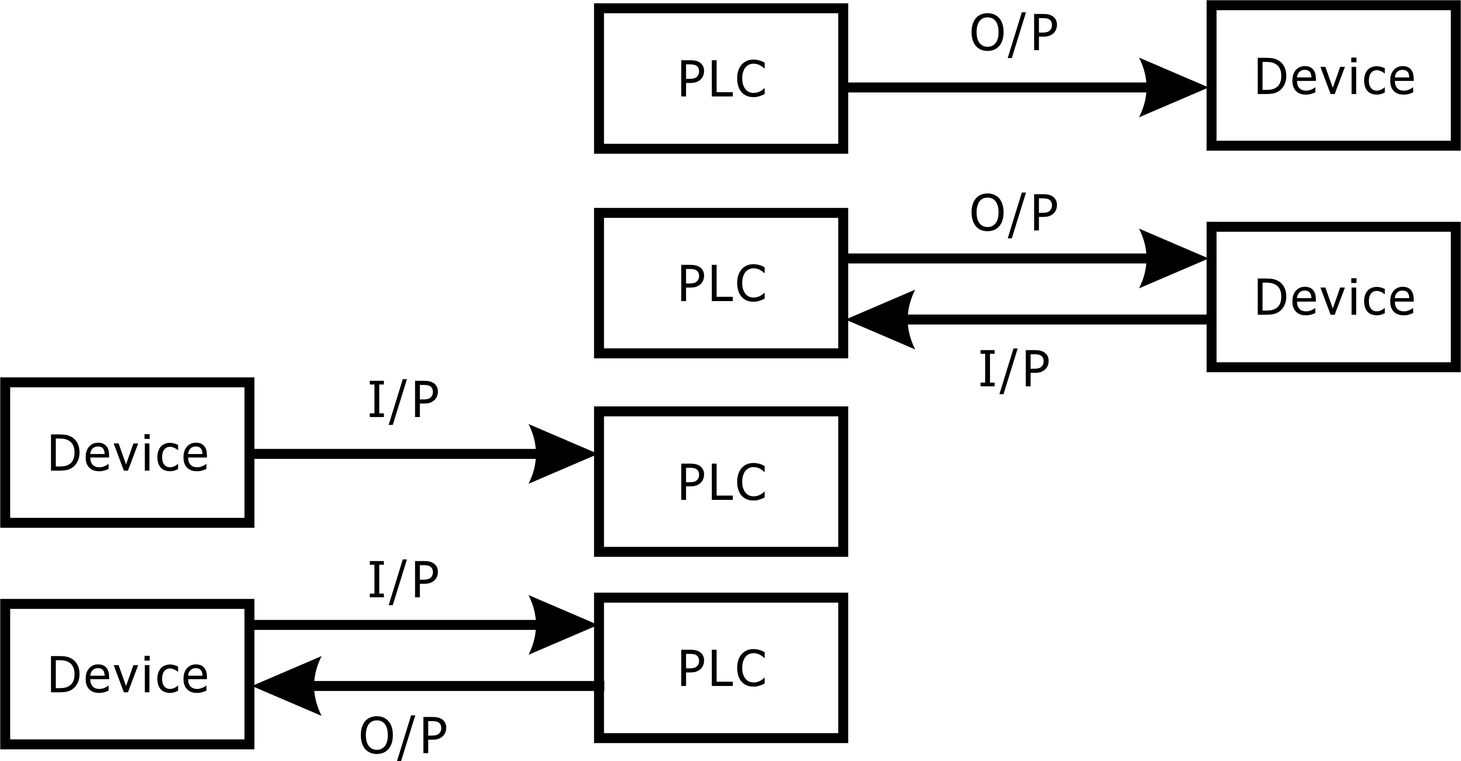 The outputs of PLC are divided into two groups: one does not care about output result and the other cares about output result from devices controlled by the outputs. The inputs of PLC are divided into two groups: one does not reply inputs and the other replies inputs.