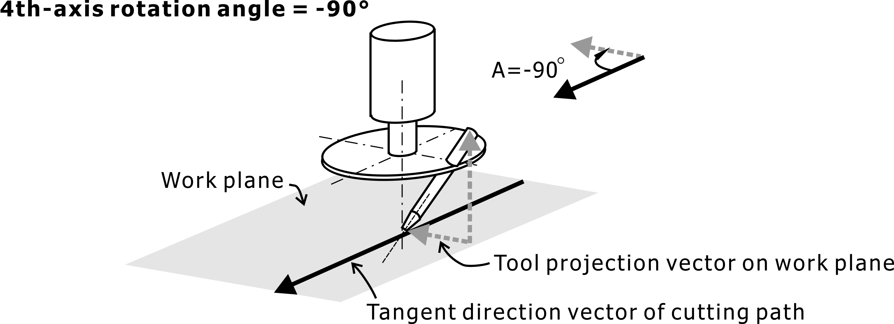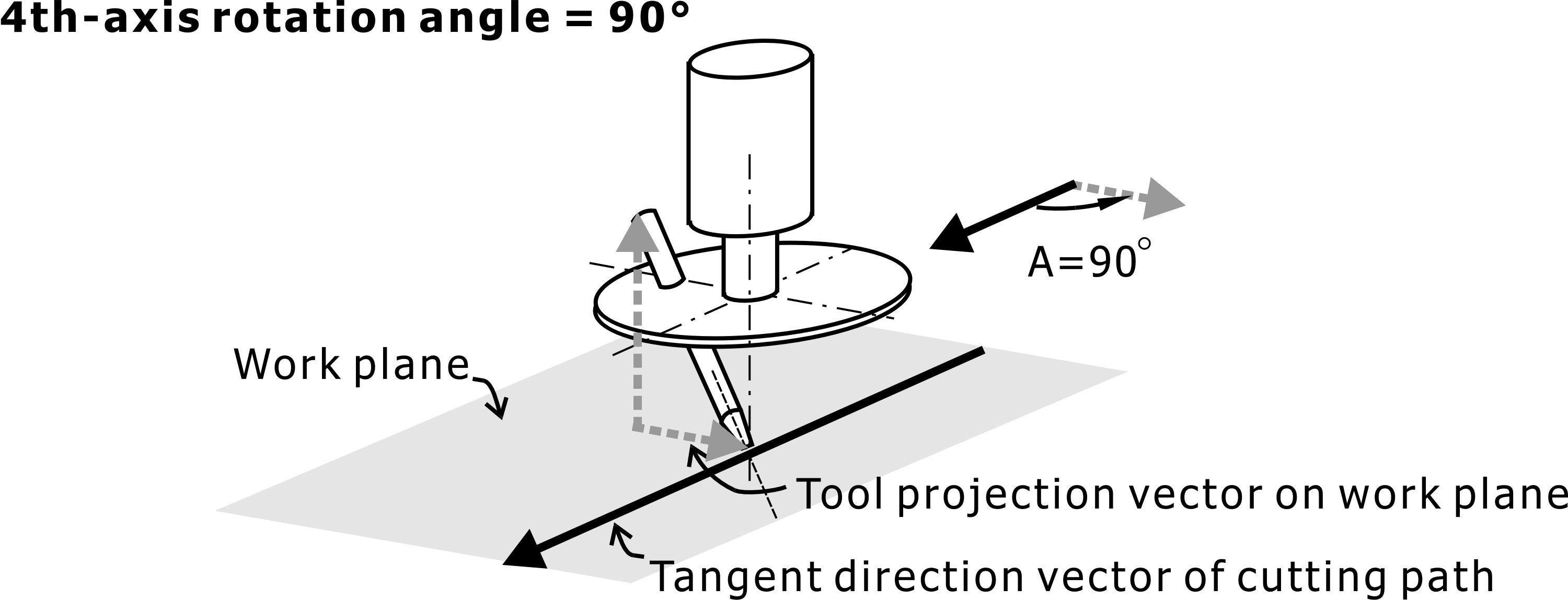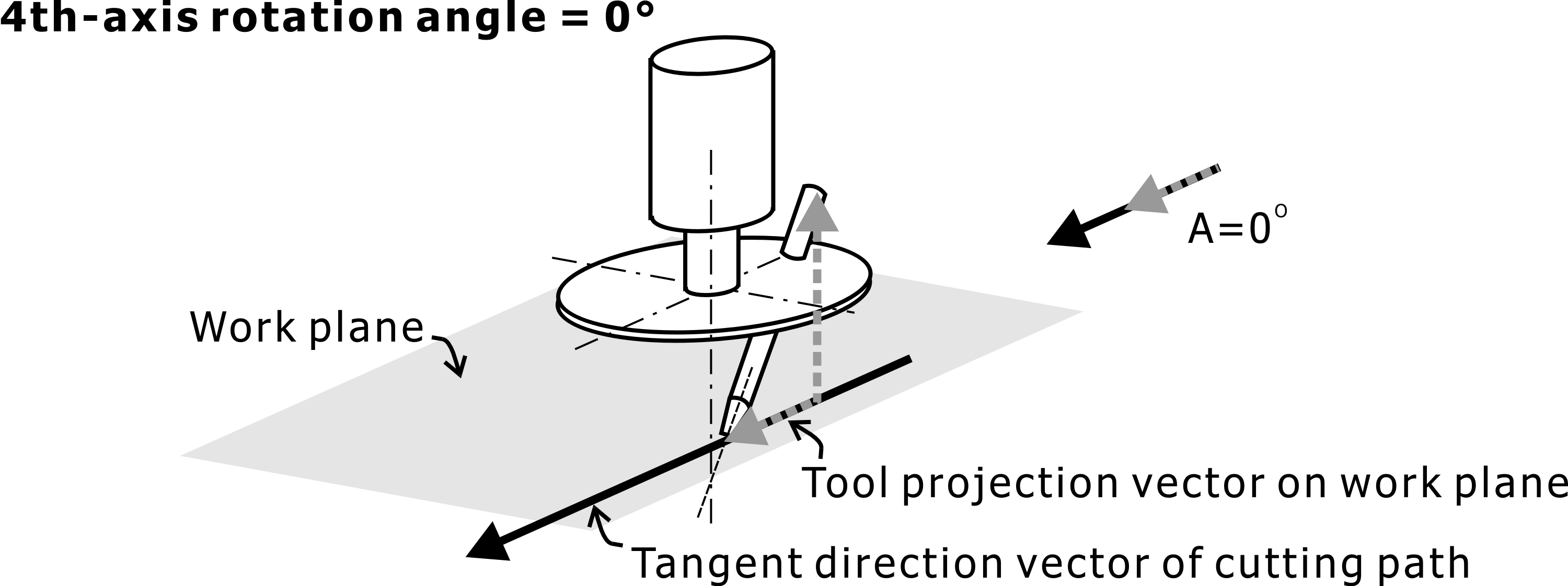 The starting tilt angle of the fourth axis is 0°. If A_ is not given in the program, it is regarded as zero.