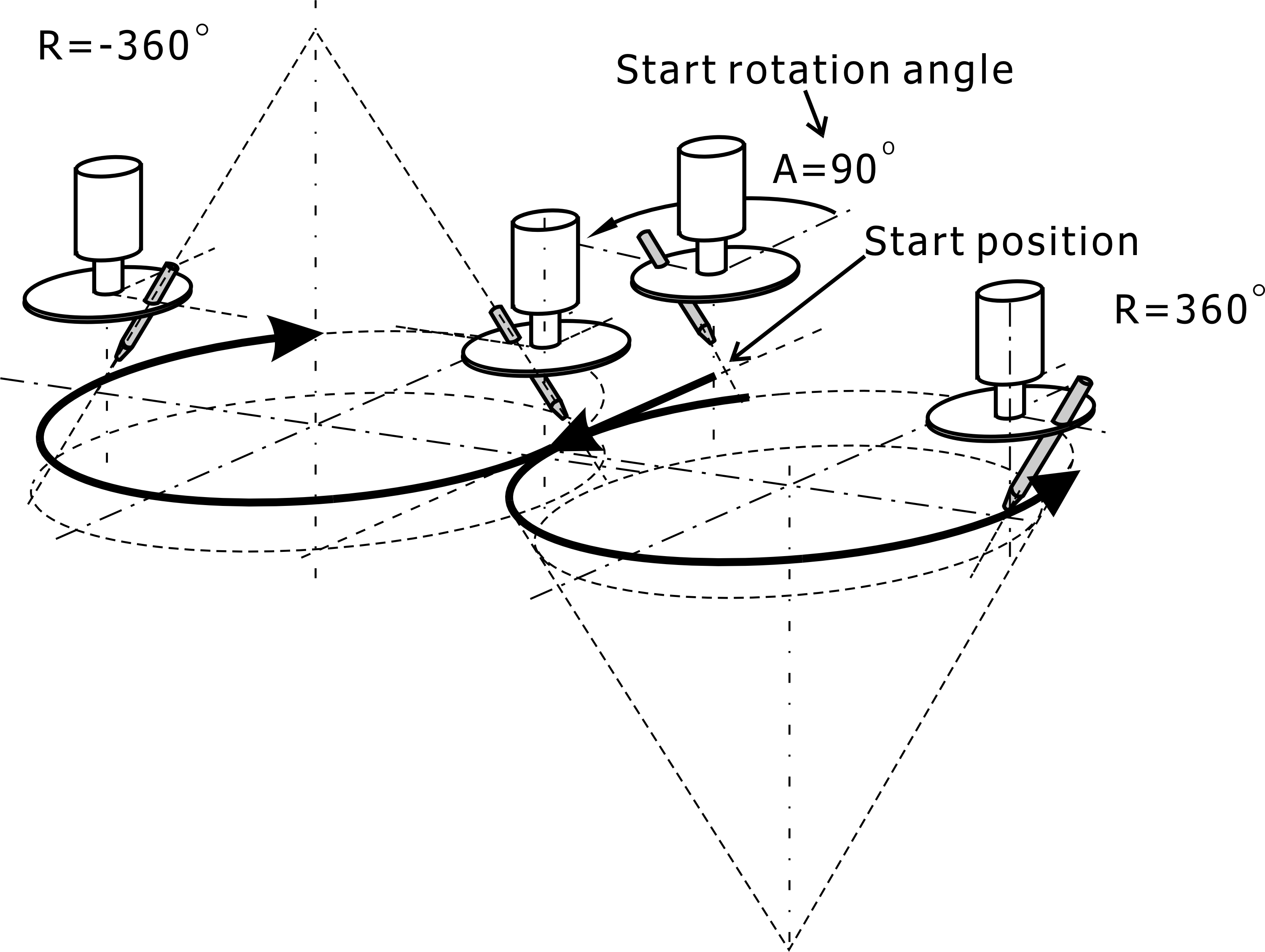 When R_ is defined as the rotation of the fourth axis of the mechanism, the value fed by the servo motor (generally 360 turns, so if this value is not given, it is regarded as 360.000), which is used as the reference for calculating the angle A_ of the preceding paragraph. The following figure shows the path when R_ is 360° and -360° when the starting tilt angle A_ is 90°: