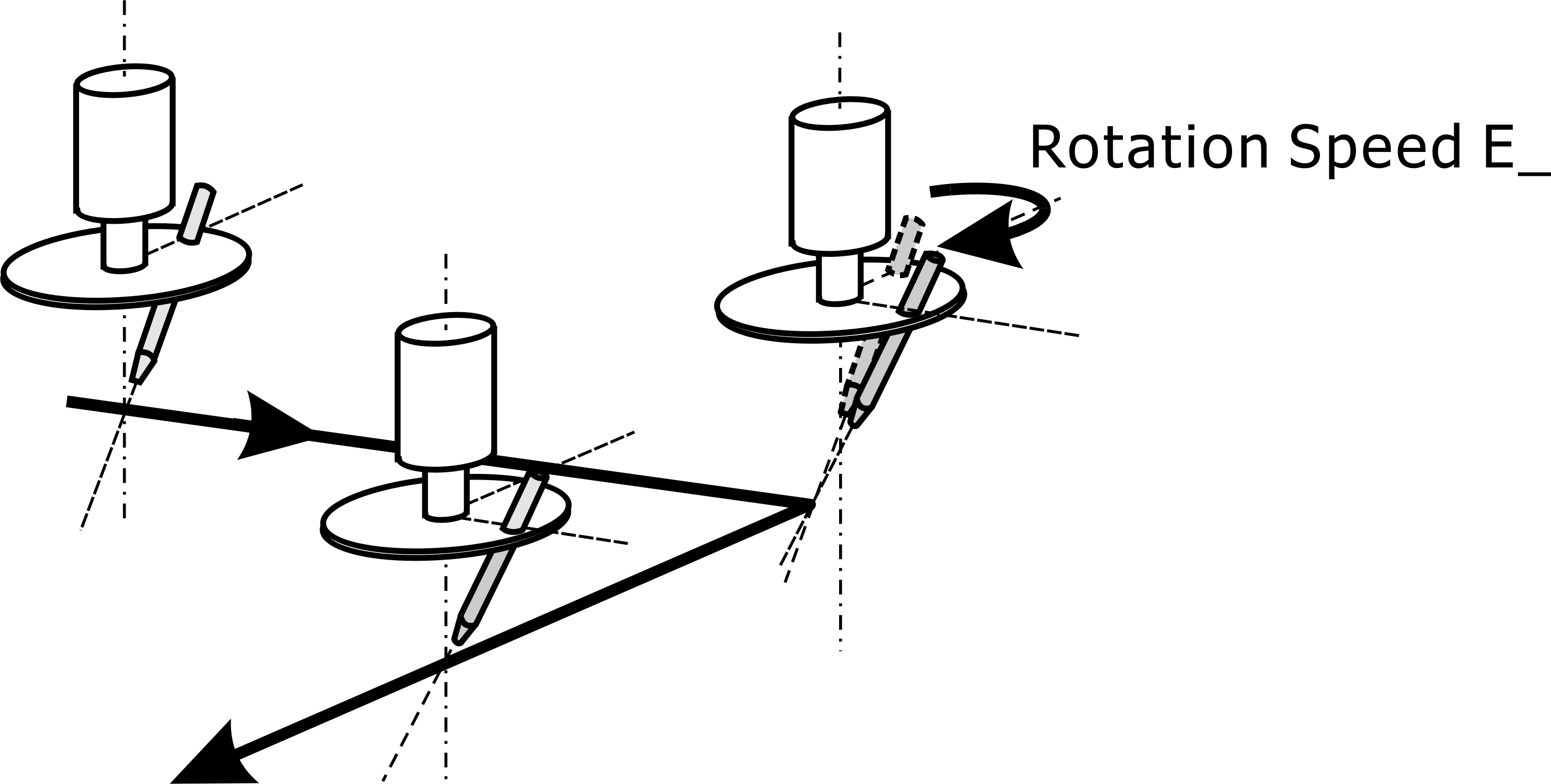 E_ defines the rotation speed per minute when the fourth axis needs to be rotated in the two linear paths. The definition of this speed is the same as the feed rate for general cutting, in units of the minimum amount of movement on the mechanism.