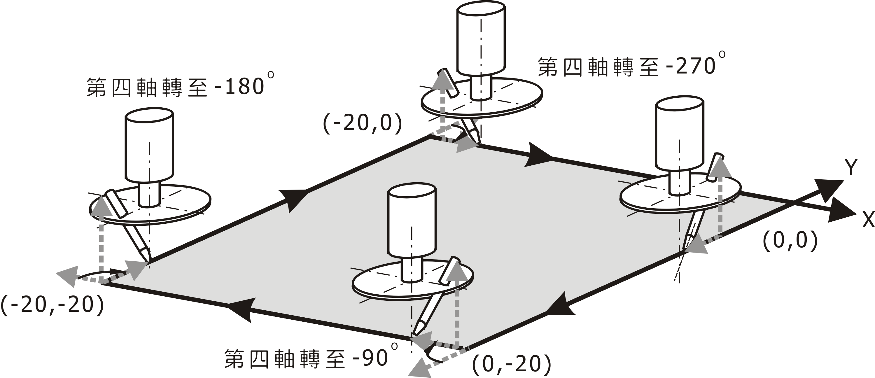 G01 X-20 ; C 軸先旋轉 0° 至 -90° 位置,開始此切削路徑,以保持刀具在相同之固定傾斜角度。