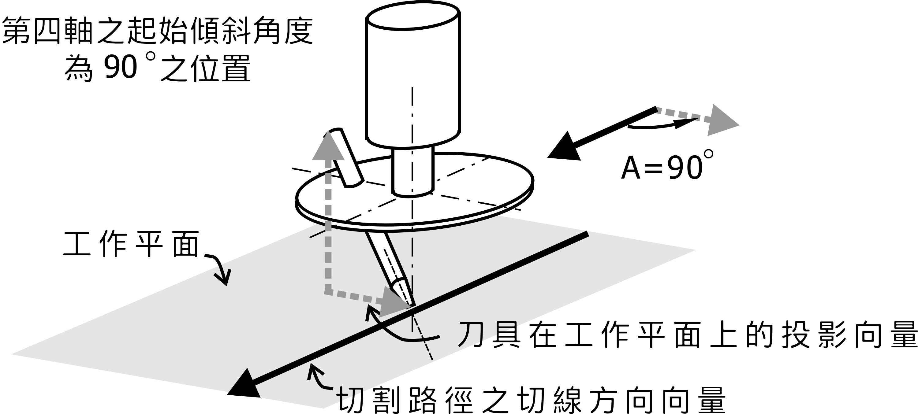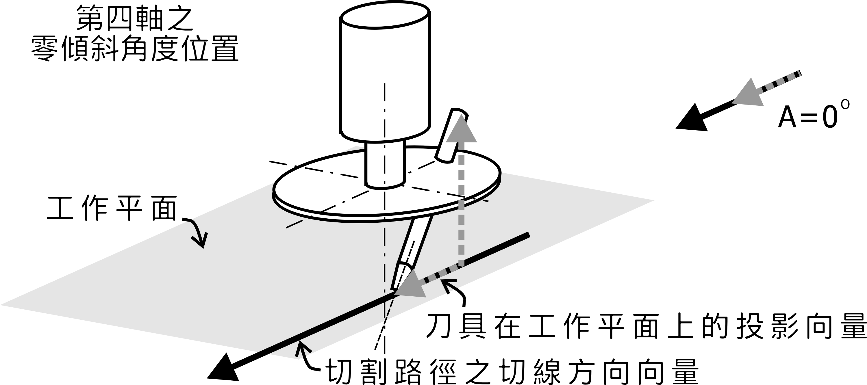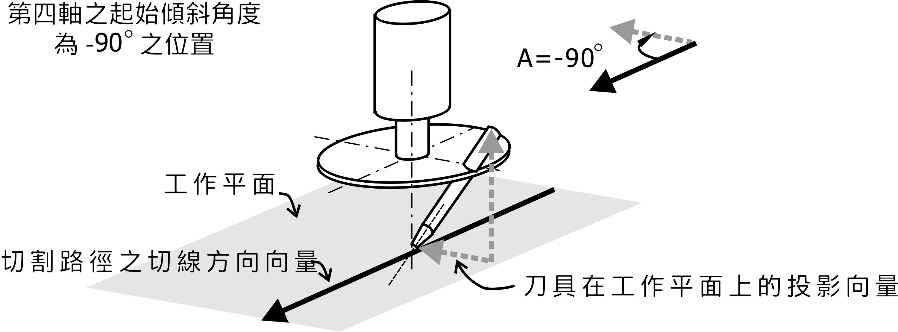 第四軸之起始傾斜角度為 0°,程式中若 A_ 未給,就視同零度