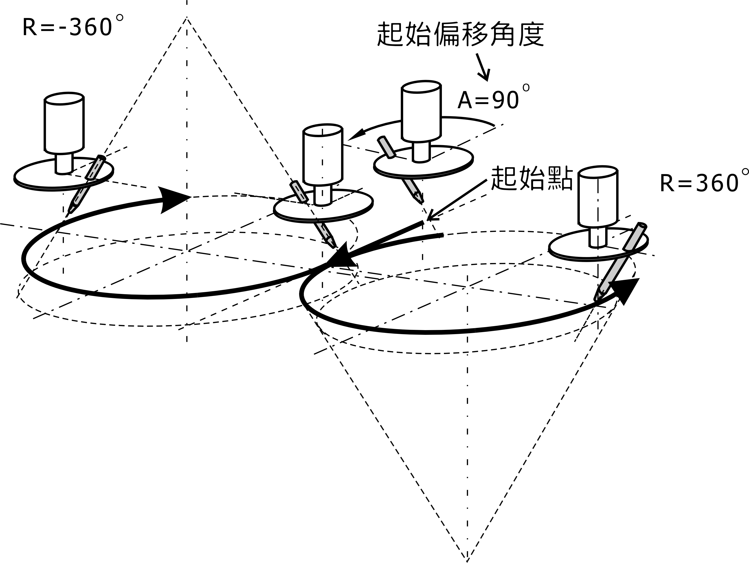 R_ 定義為機構上第四軸旋轉一圈時,伺服馬達進給的數值(一般而言是 360°,所以若此值未給,則視同 360.000),以作為前項 A_ 角度值的計算基準。下圖是以起始傾斜角度 A_ 為 90° 時,R_ 為 360° 時和 -360° 時的路徑:
