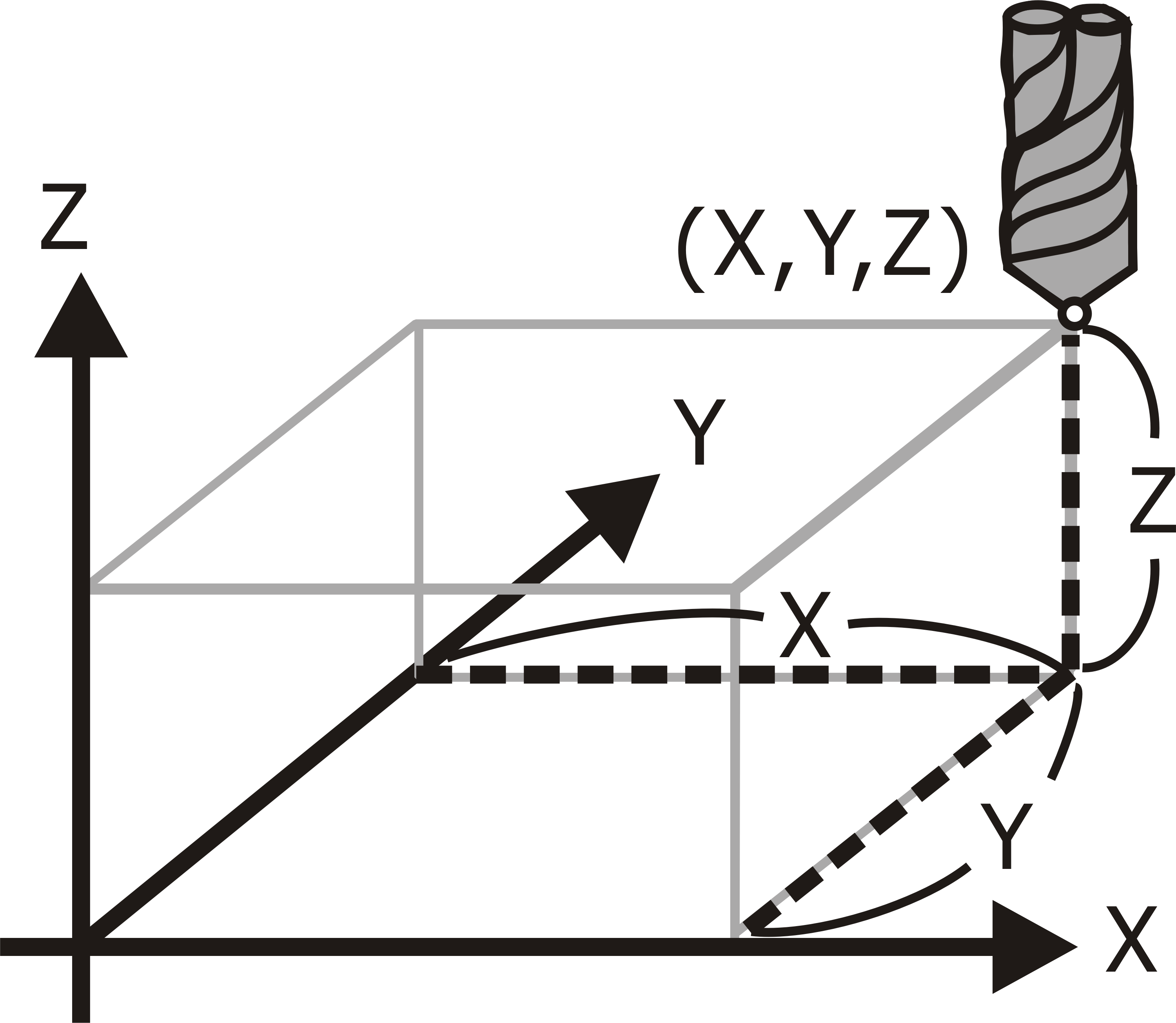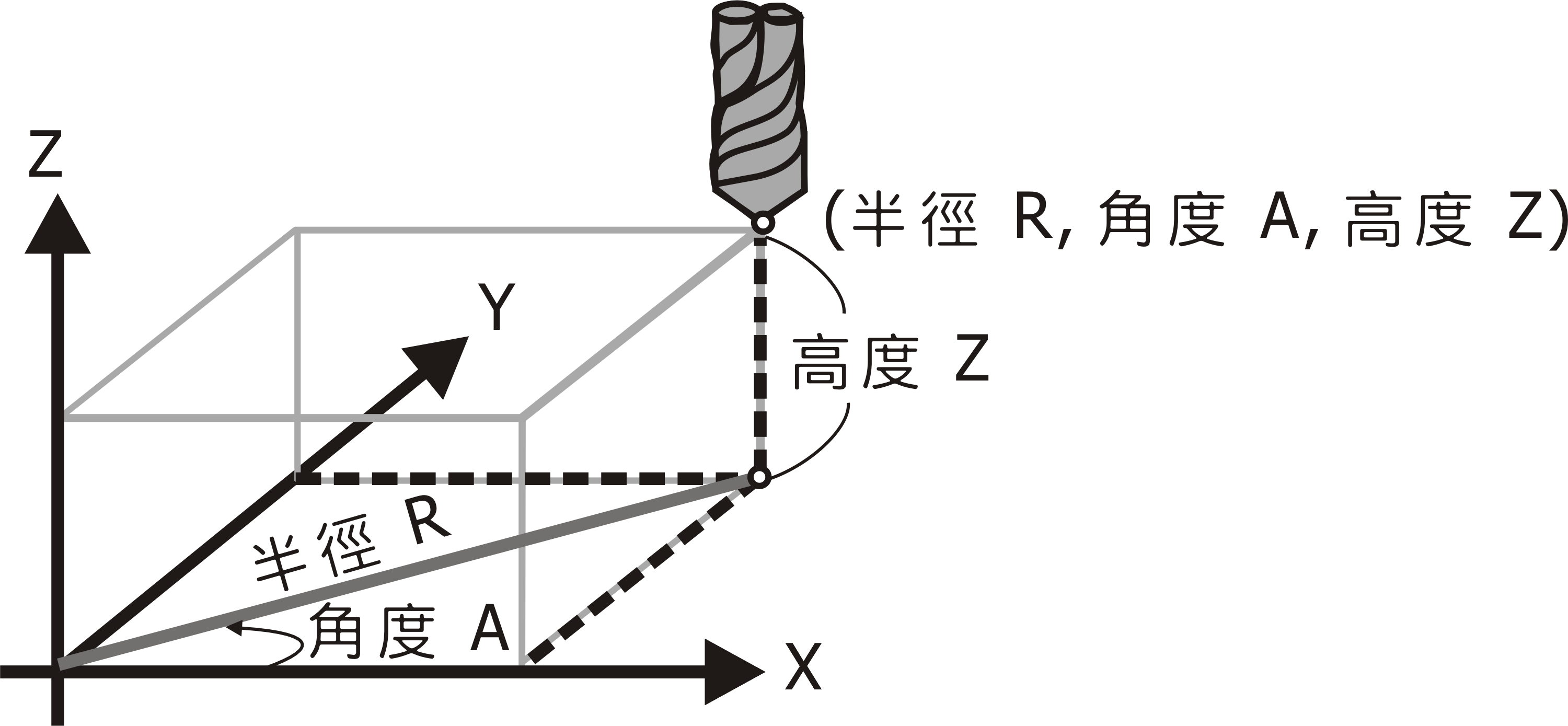 於軸向移動 G 指令中,要給目的地之各軸值,可以直角座標系或極座標系規劃之,分別由 G15、G16 指令設定。(開機預設為 G15 直角座標系,若要用極座標系,需輸入 G16 指令)。