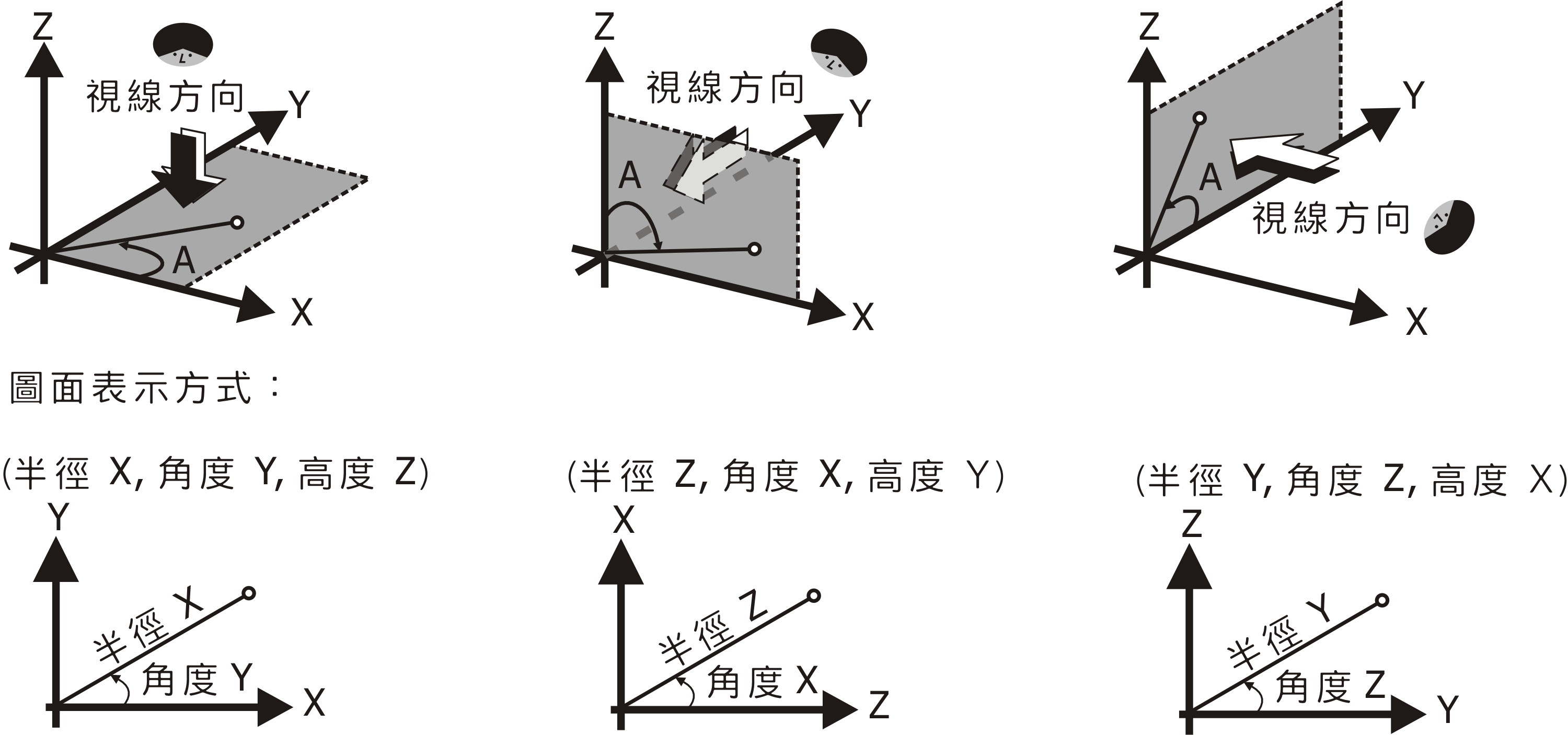 極座標與平面選擇有密切關連, 因此平面選擇(G17/G18/G19)必須先設定。極座標同樣以 X、Y 和 Z 為其位址代碼, 但此 X、Y 和 Z 值對應於極座標半徑、角度與高度之對應表如下表所示: |