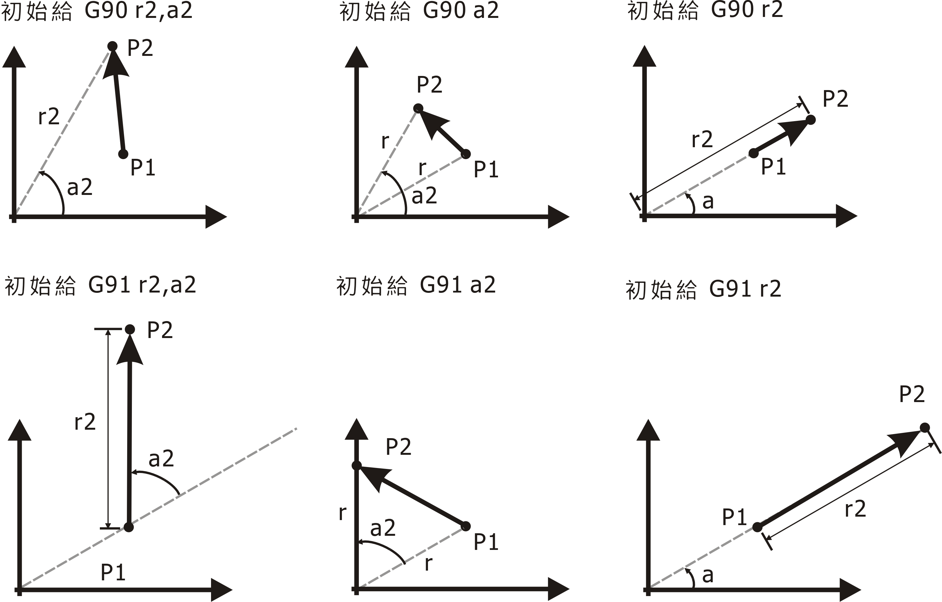 於極座標中半徑與角度可分別以 G90/G91 定義為絕對座標或相對增量值,如此所要偏移的目的地將因半徑或角度被設定為絕對座標或相對增量值之先後次序不同而異。玆歸納此類可能的組合如下: