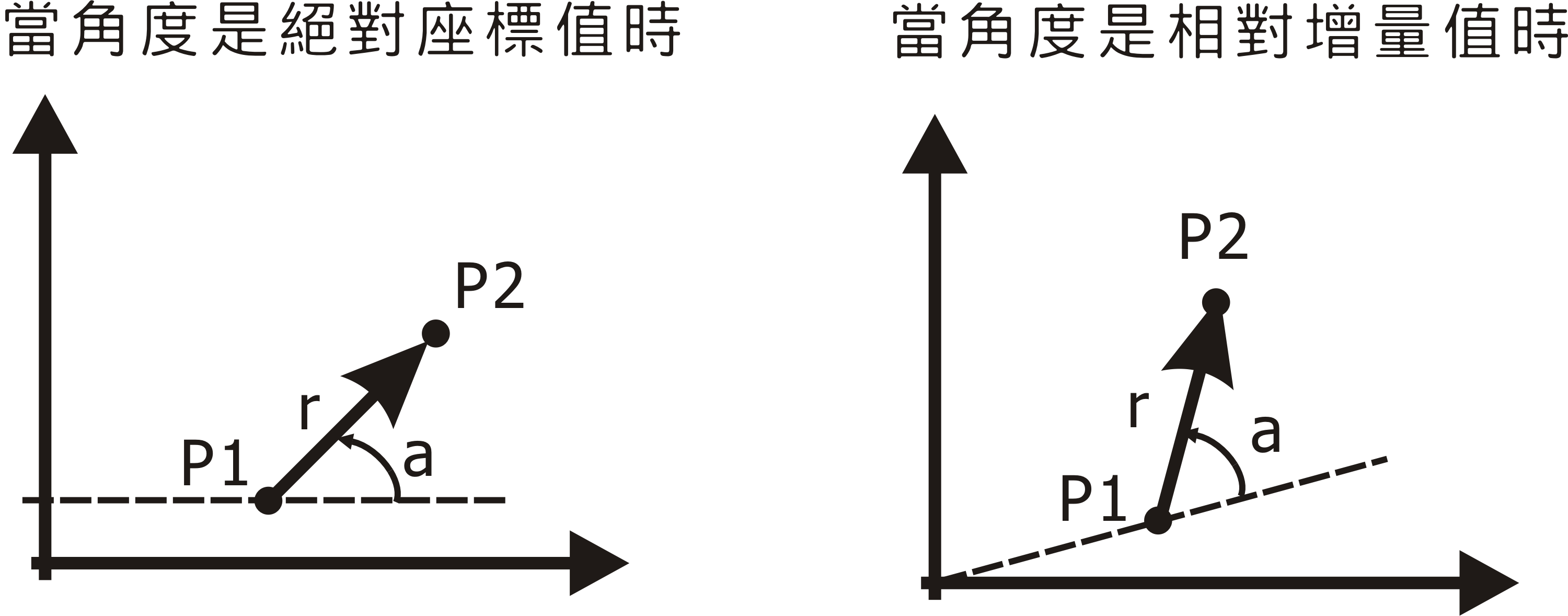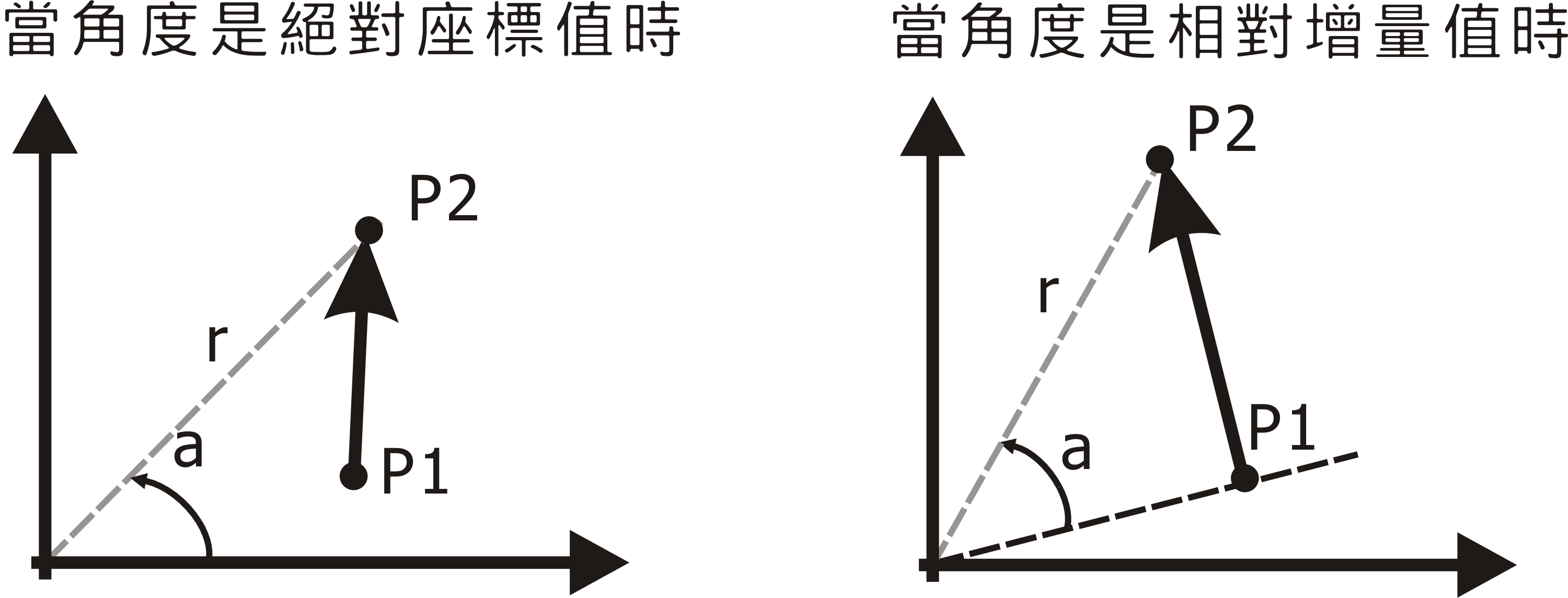 當角度剛轉成相對增量值時,是以目前位置點 P1 所定義的角度為起始角度,然後再將相對增量角度加在其上;若目前位置點正落在原點上,則其起始角度等於零。 |