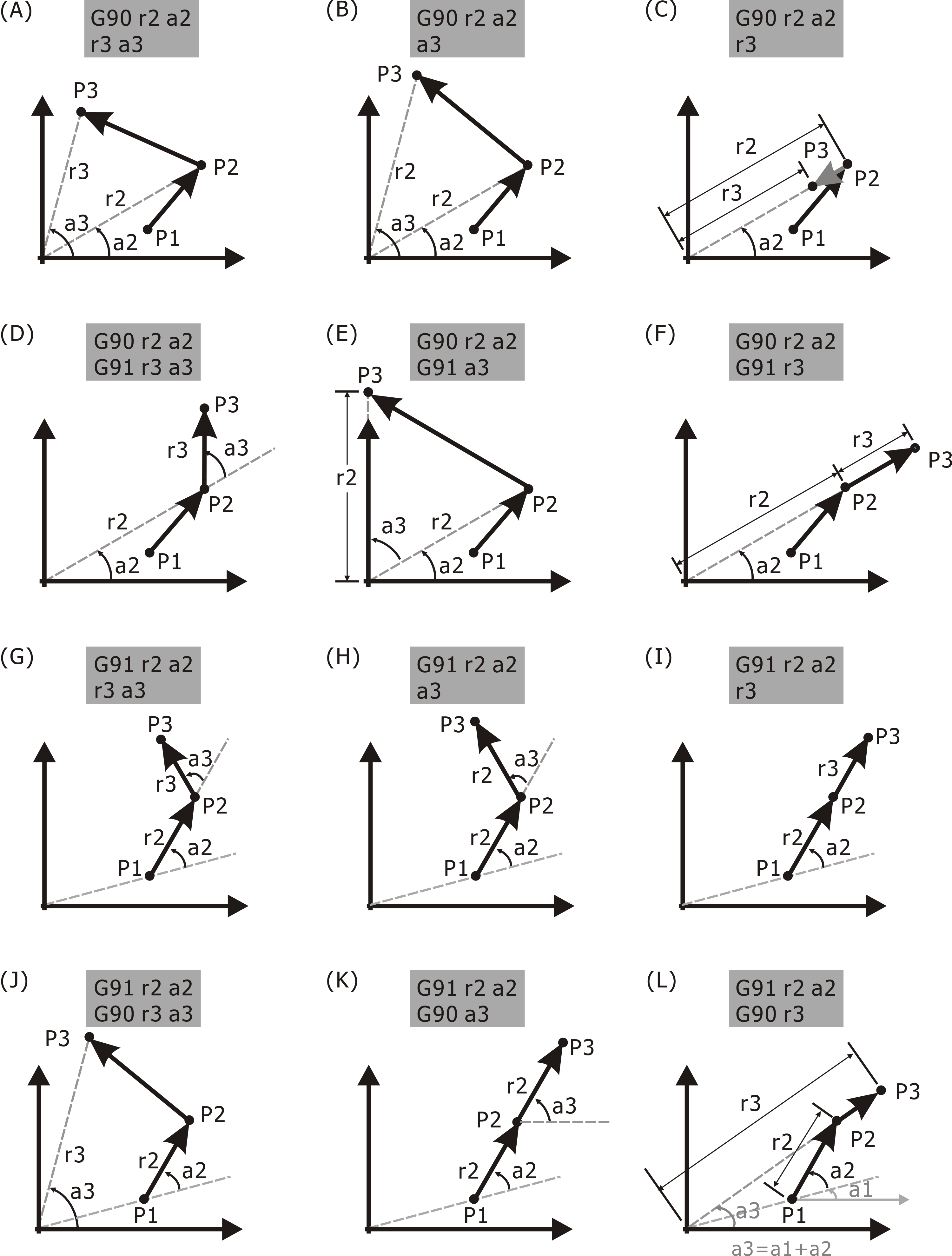 以下列出半徑或角度被設定為絕對座標或相對增量值之先後次序不同時,而可能產生之其它各種組合: