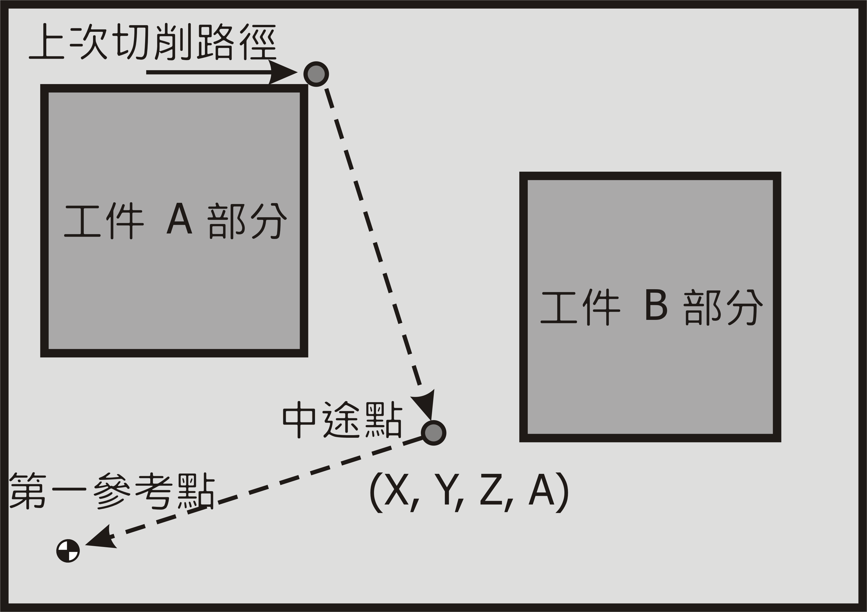 G28 指令格式中之座標位址是指中途點座標位置。此指令可使刀具以快速定位(G00)移動經由指定之中途點回到第一參考點(通常是機械原點)。經由指定中途點回第一參考點可確認刀具移動路徑之安全性,避免碰撞工件;此中途點之位置值可為絕對座標或相對增量。若只給 G28 指令而無指定任何軸向,將不動作,只有在指令中有指定的軸向時才會動作。
