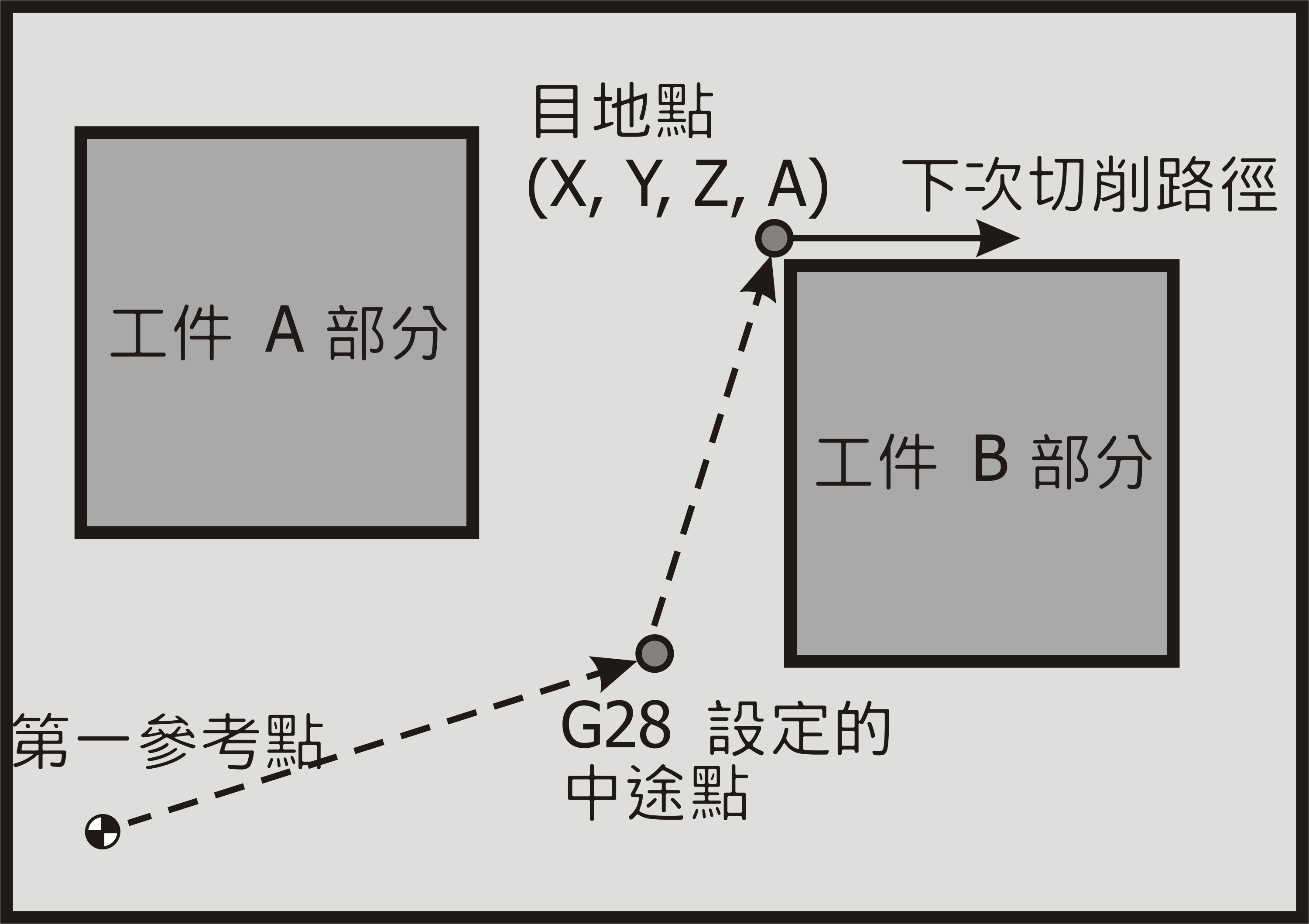 G29 指令格式中之座標位址是指刀具欲到達之目的點座標位置。此指令可使刀具由第一參考點經過中途點到達目的點,如此可確保刀具經由此安全路徑到達欲切削加工之目的點位置。中途點為 G28 指令中所指定的點,在使用 G29 指令之前,必須先使用 G28 指令,以免 G29 執行時不知道中途點位置,而發生錯誤。