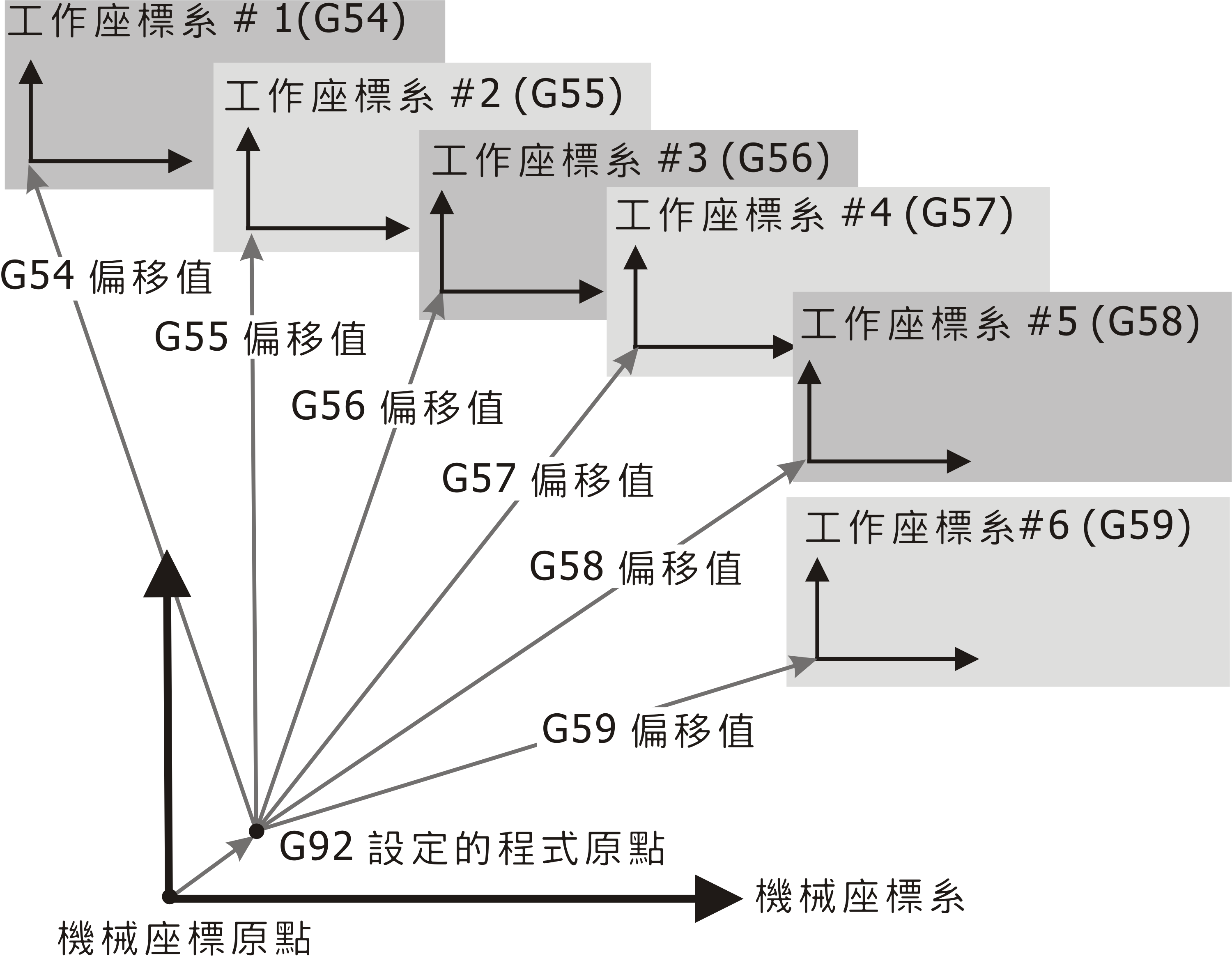 INCON-M84/M86/M86R 使用說明4 程式碼4.10 單位與位置指令 4.10.5 G54~G59:工作座標系選定 格式: G54 G55 G56 G57 G58 G59 G54~G59 指令可用來選擇六個不同的工作座標系,開機時的預設工作座標系為 G54。此六個工作座標可在 "參數→座標偏移" 項目中設定。 G54~G59 工作座標系
