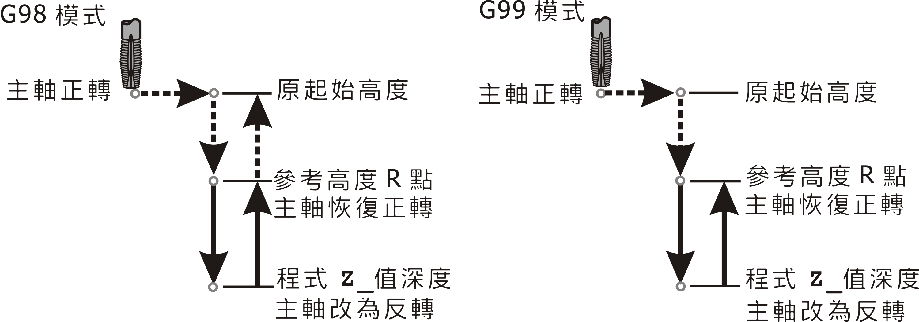 G84 指令用於右手攻牙,故須先使主軸正轉(M03),再執行 G84 指令。執行 G84 指令時,刀具先快速定位至指定的座標位置 X_Y_,再快速定位到參考高度 R_ 處,接著以進給速率 F_ 攻牙至孔座位置 Z_ 後,主軸改為反轉且同時向 Z 軸正方向退回至參考高度 R_ 點,退至 R_ 點後主軸即恢復原來的正轉。