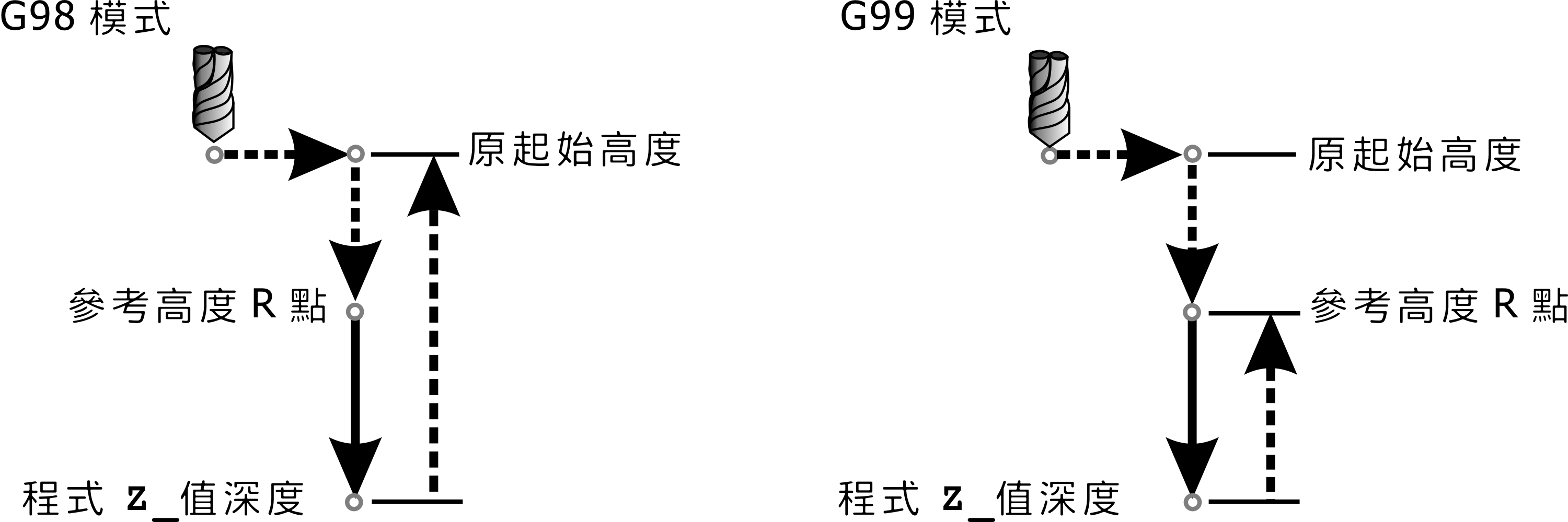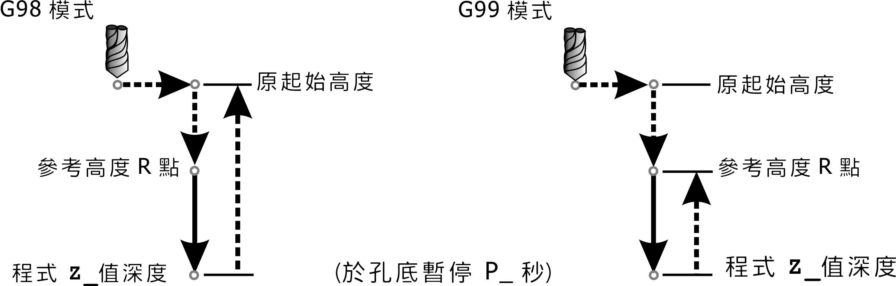 G81/G82 指令為一般鑽孔,簡單搪孔有時也可使用 G81/G82 指令。執行此指令時,鑽頭先快速定位至 X_Y_ 所指定之座標位置,再快速定位至 R 點,接著以設定之進給速率 F_ 向下鑽削至孔底位置 Z_,最後快速退刀至起始點(G98 模式)或 R 點(G99 模式)完成循環,如下圖所示。