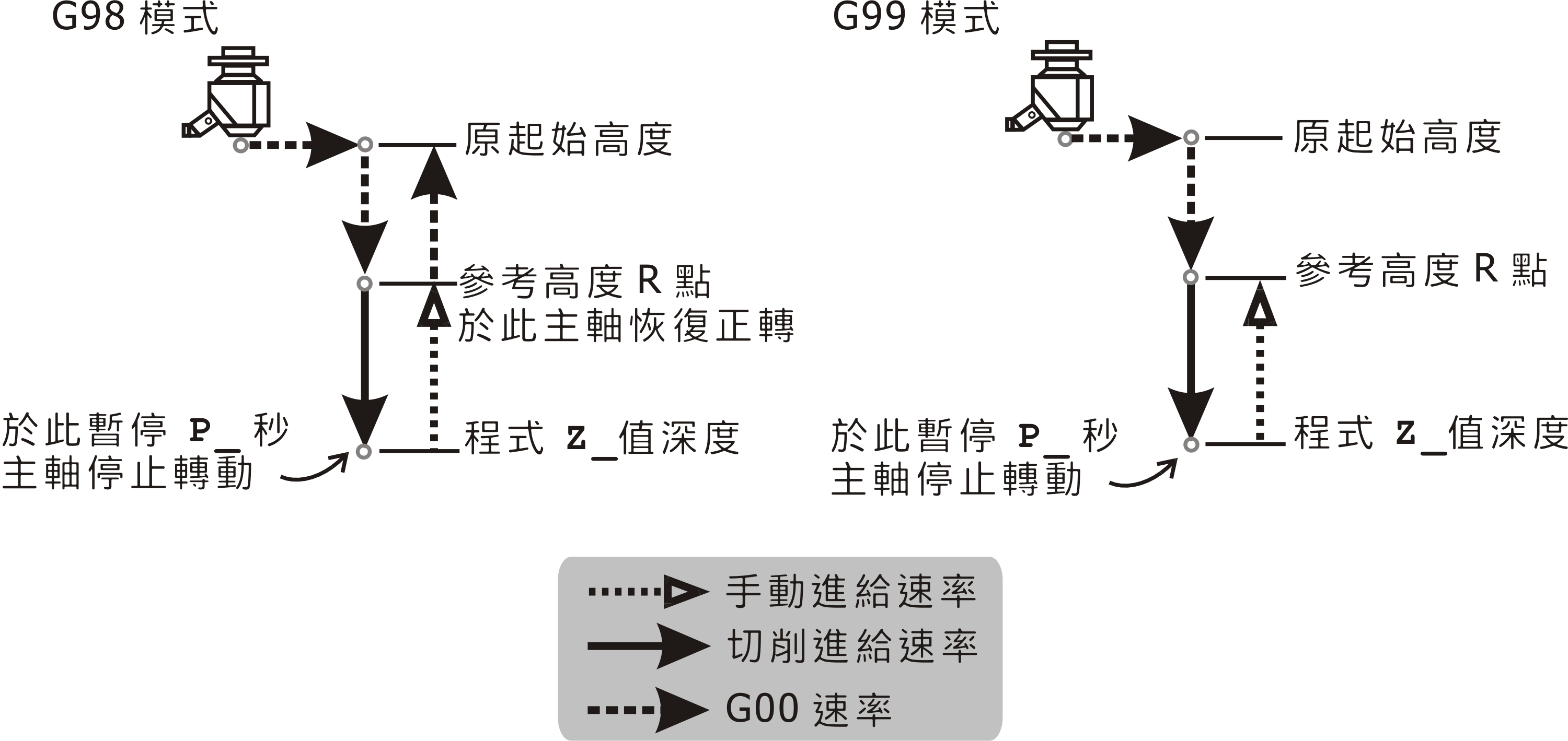 程式在確定刀具已在參考位置 R_ 點以上後,即自動恢復主軸之正轉,請將頭、手離開主軸,以確保安全! |