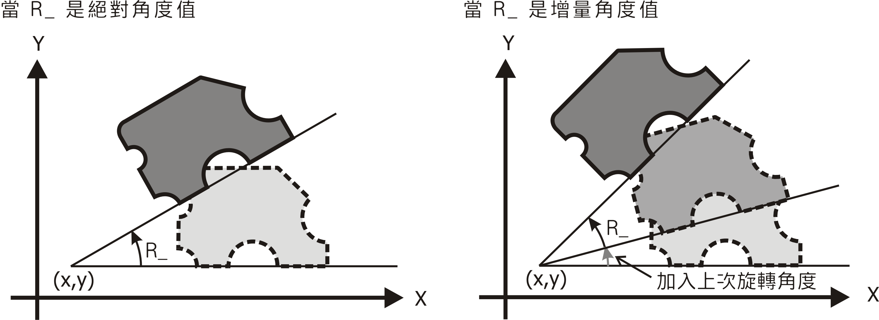 R_ 值表示要旋轉的角度,正、負值分別表示往逆時針/順時針方向旋轉。此 R_ 值可由 "參數→旋轉→絕對/增量角度值" 設定為絕對值或增量值,若選擇增量值且在 G91 模式下時,旋轉角度將會累進,直到 G69 取消座標旋轉指令出現,此旋轉角度才被重置為零。