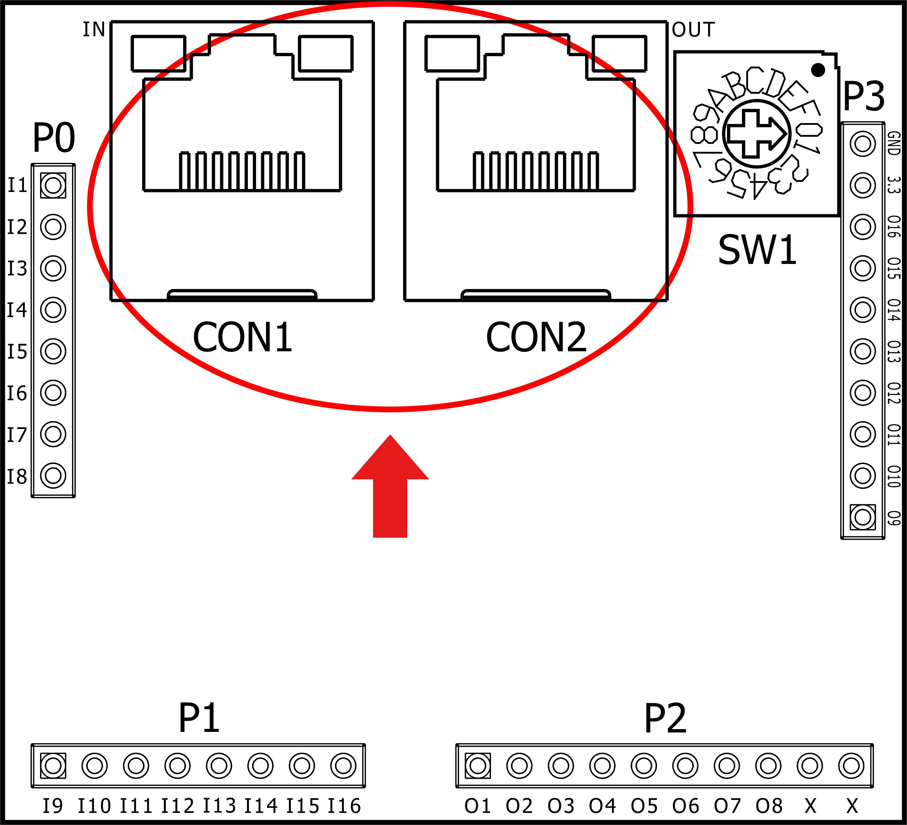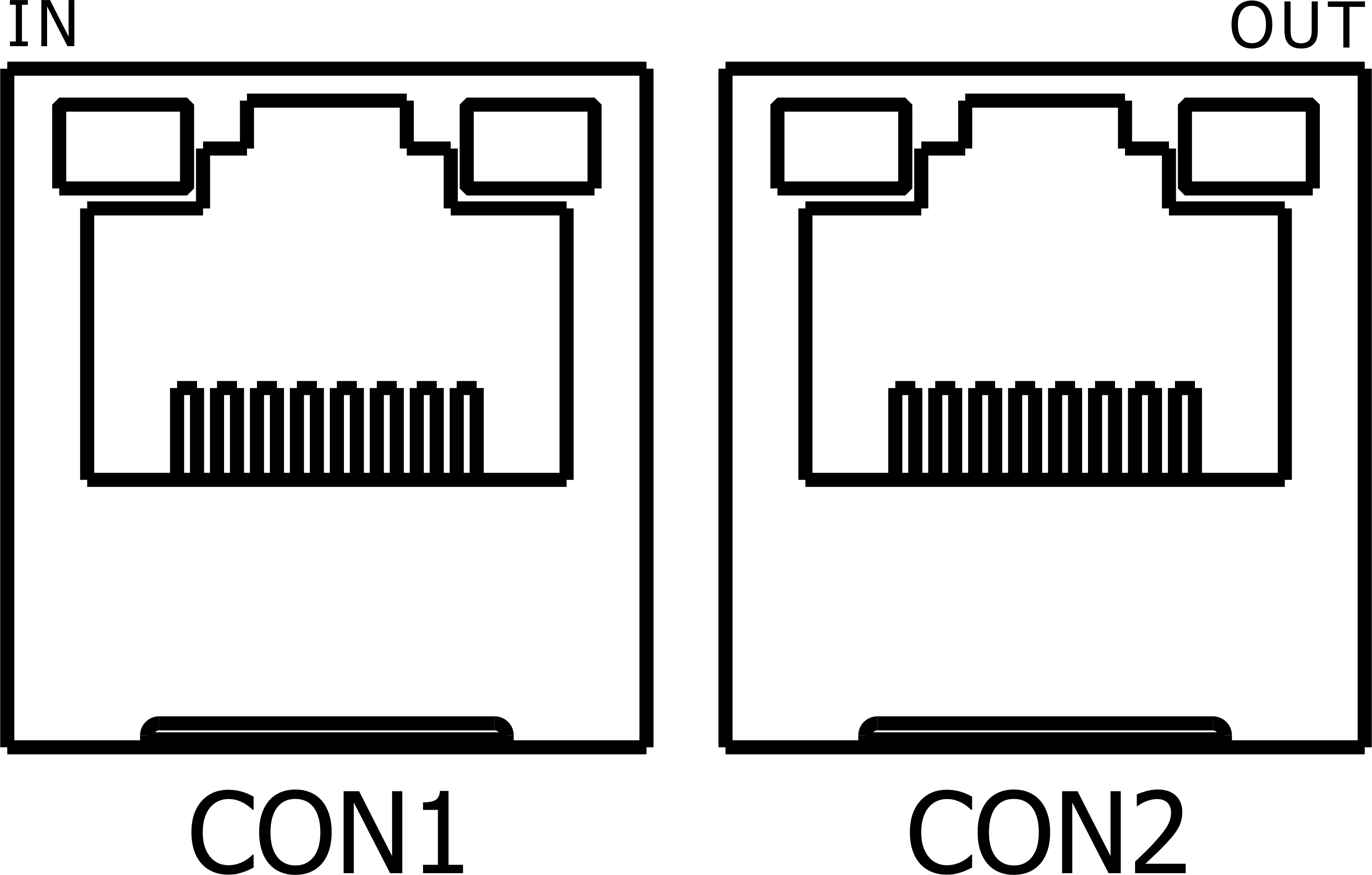 INCON-M84/M86/M86R Integration Manual2 Modules Connection2.6 ENU: Embedded I/O Communication Unit 2.6.4 CON1, CON2: EtherCAT Ethernet Communication Connector CON1:EtherCAT cable IN Connect to the previous EtherCAT device. CON2:EtherCAT cable OUT Connect to the next EtherCAT device. CON1, CON2 EtherCAT Connector CON1, CON2 Placement Drawing