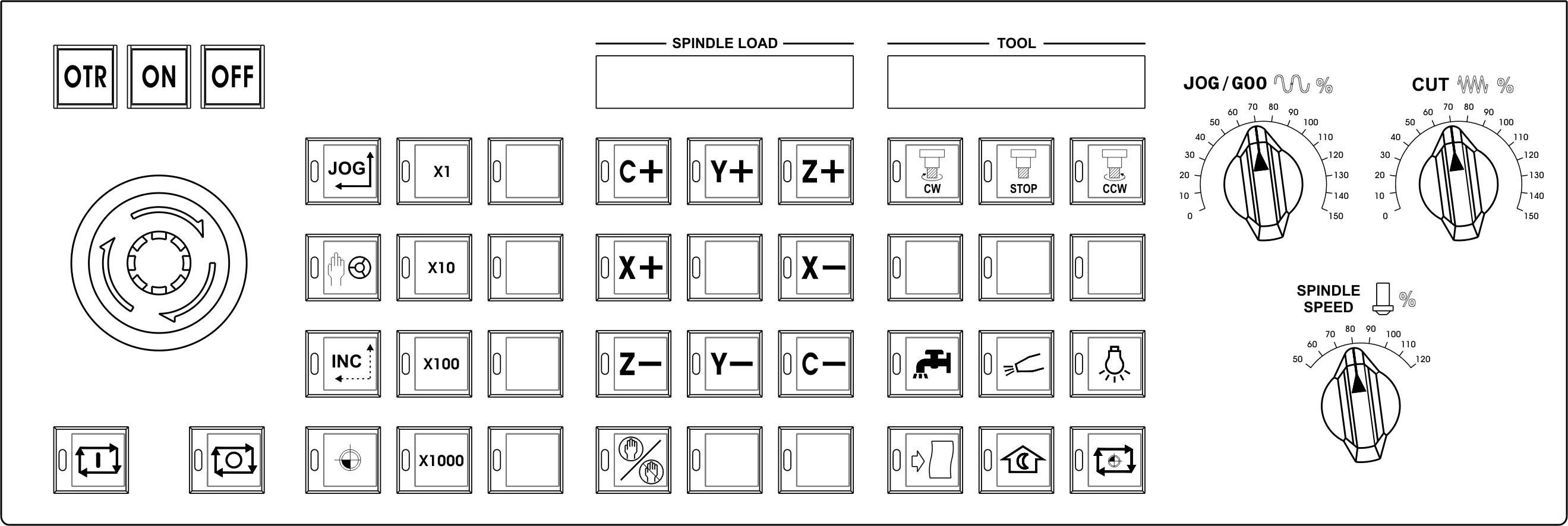 INCON-M84/M86/M86R PLC Manual4 PLC Planning4.1 Target Machine Specifications 4.1.39 Machine Panel Diagram The target machine in this example uses the communication module to embed the mechanical panel, the panel plan as shown below: Machine Panel Diagram