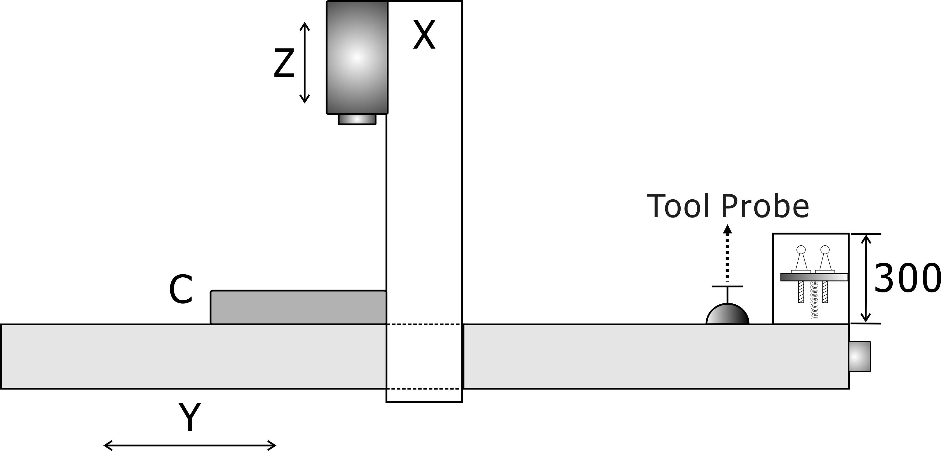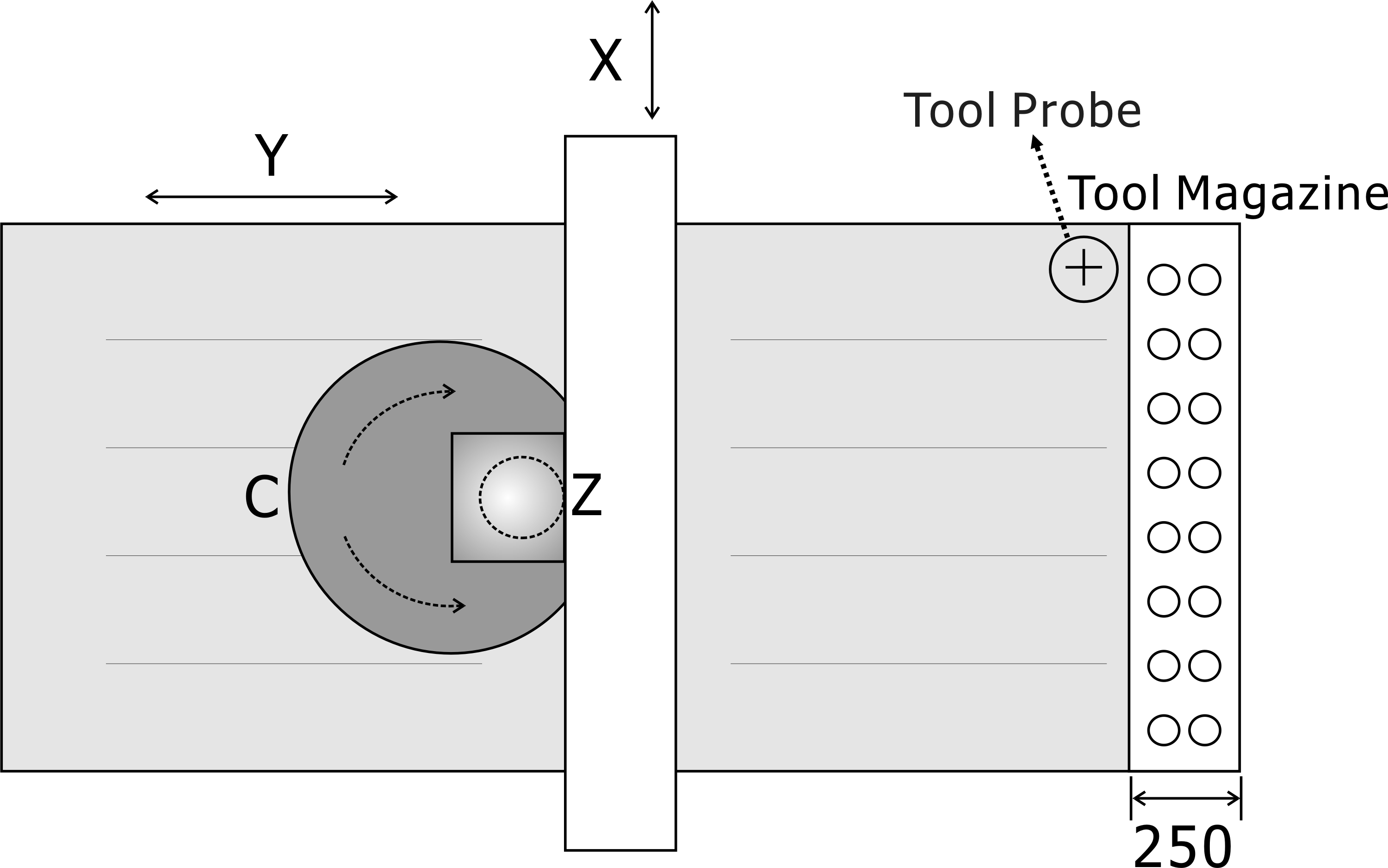 INCON-M84/M86/M86R PLC Manual4 PLC Planning4.1 Target Machine Specifications 4.1.21 Traverse Limit Bedside Top View Diagram Tool magazine at rear of machine, and motion cannot enter tool zone when cutting. (As shown above and below) Bedside Side View Diagram