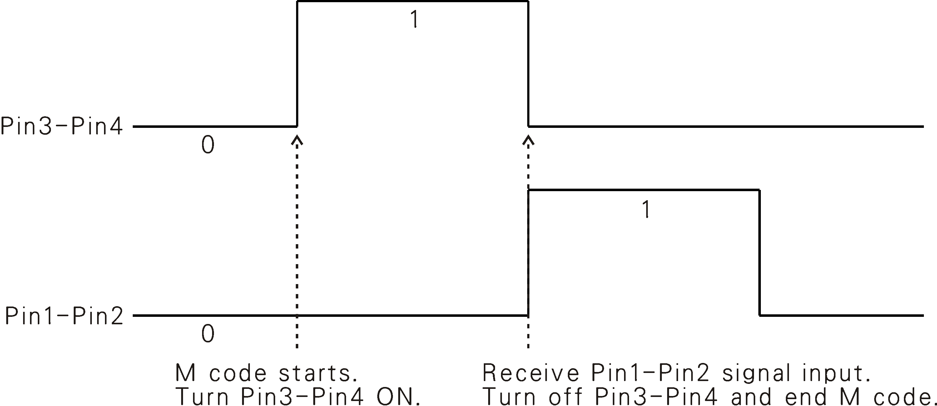 When the controller executes the command of M10, the Pin3-Pin4 output contact will be turned on, and after the Pin1-Pin2 input contact is turned on, the Pin3-Pin4 output contact will be closed and end at the same time M code and execute next line instruction.