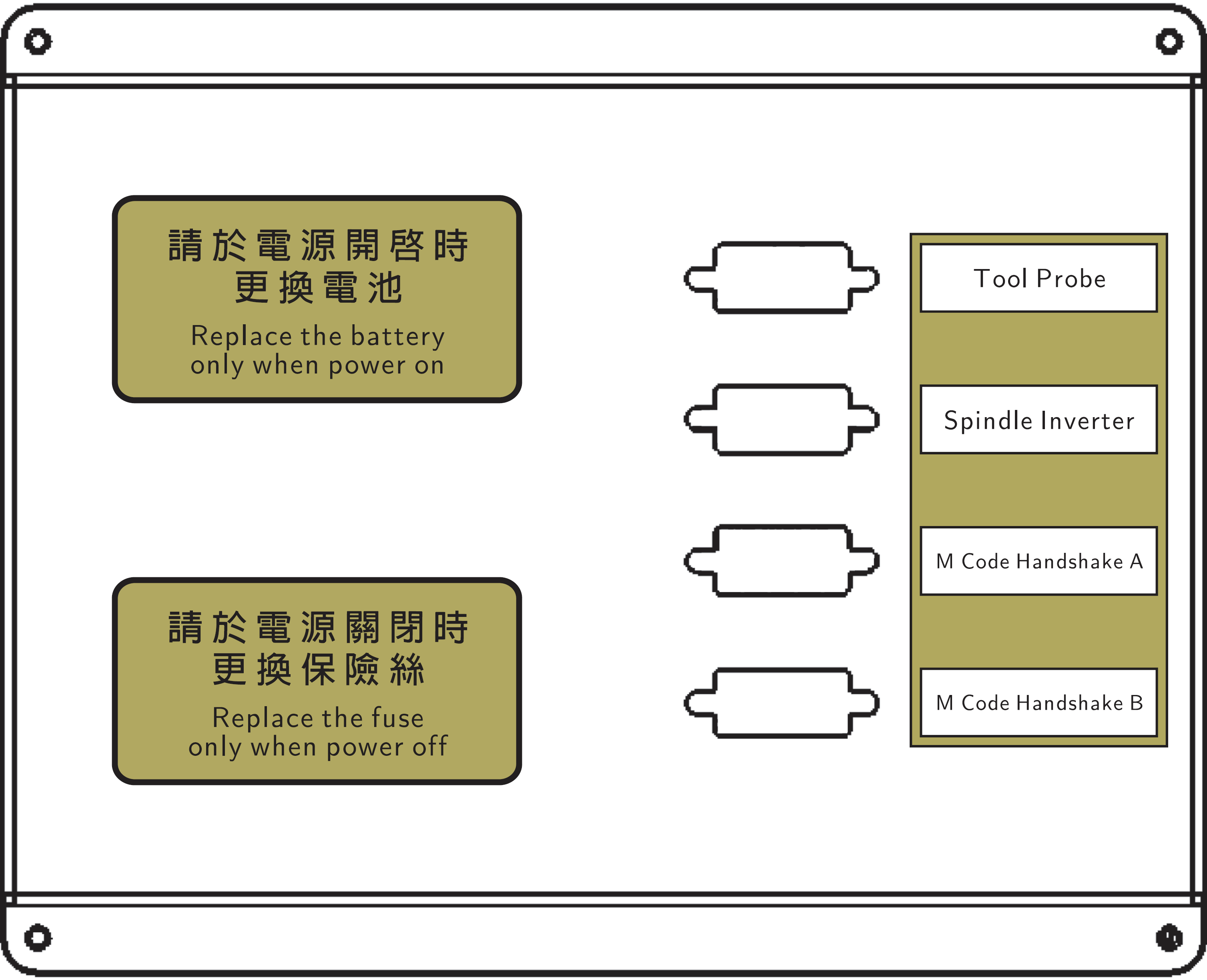 There is an I/O connecting box on the right side of i83. It provides spindle on/off output, tool probing input and two sets of I/O handshake M code contacts.