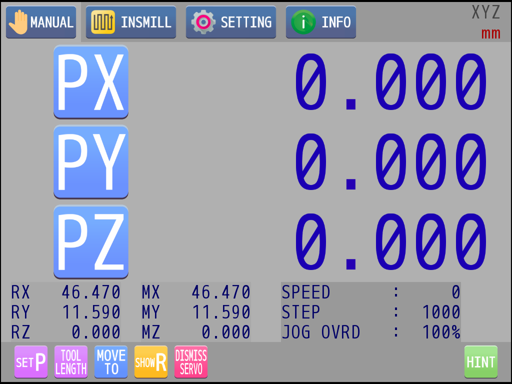 Press the knob to adjust the step and Jog override (step: 1000 >> 100 >> 10 >> 1, override: 100% >> 50% >> 20% >> 10%). |
