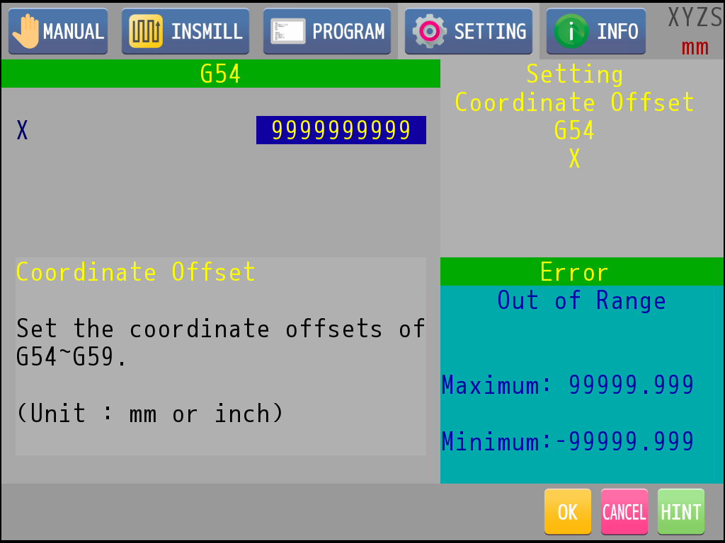 Press key 2 to leave input mode and return to upper layer. If the value is not in the proper range after editing, an error message will pop up at the bottom right. |