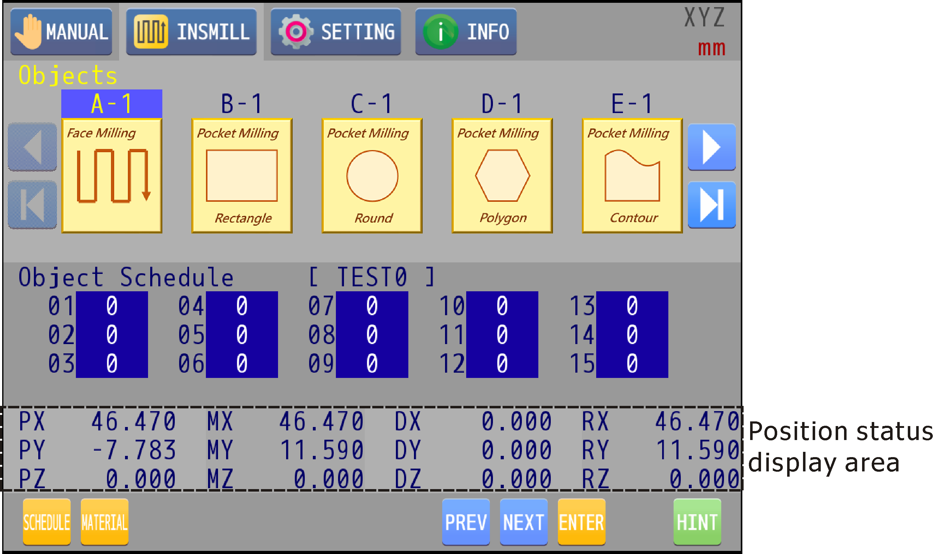 - When the INSMILL object or program is in run state, press it to pause (FeedHold).