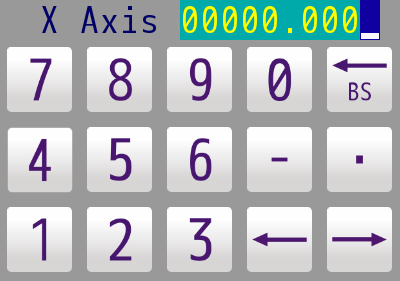 If X-axis is selected and key 1 is pressed, the dialog of program position modification mode will appear. the operation method is the same as the axis-to-set dialog, user can set the chosen axial program position to zero, half of the current program position, or any value. |