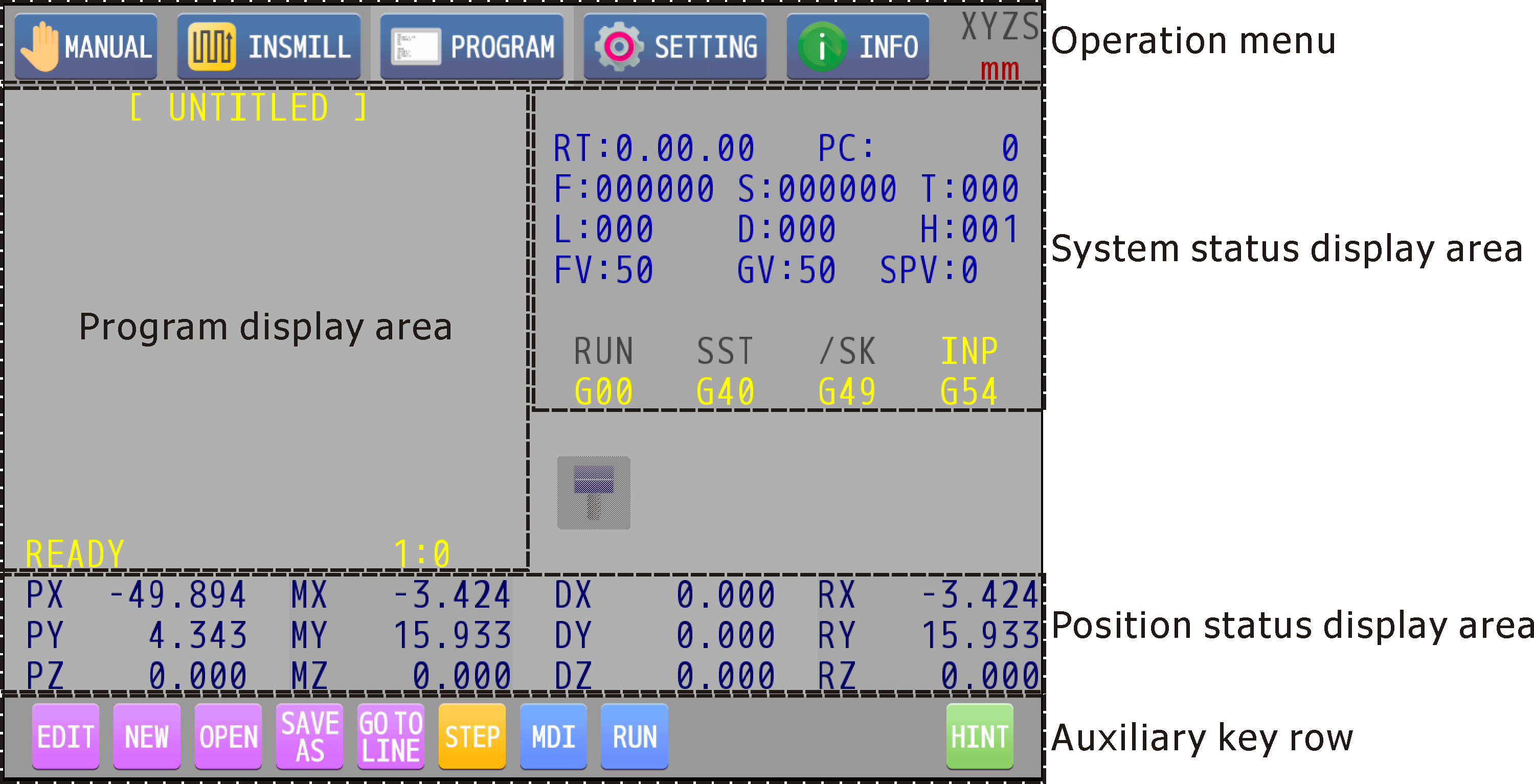 Program page is divided into five parts: operation menu, program display/editor, system status display area, position display area, and auxiliary key row, as shown below.
