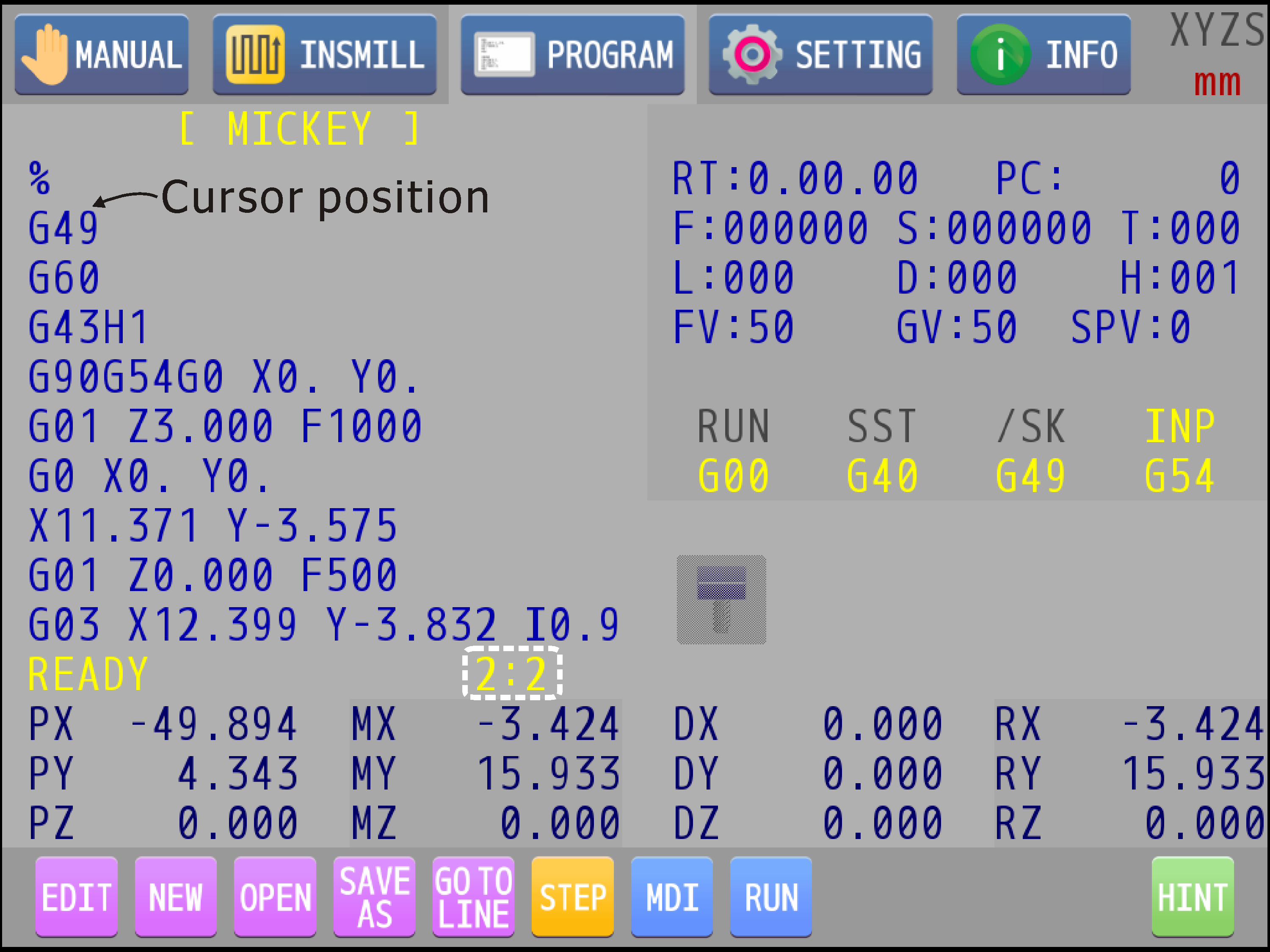 The content of the program to be executed or edited is shown in the program display/editor area. The name of current program is shown on the top of this area. If the program has not been stored in a certain name, it shows "UNTITLED".