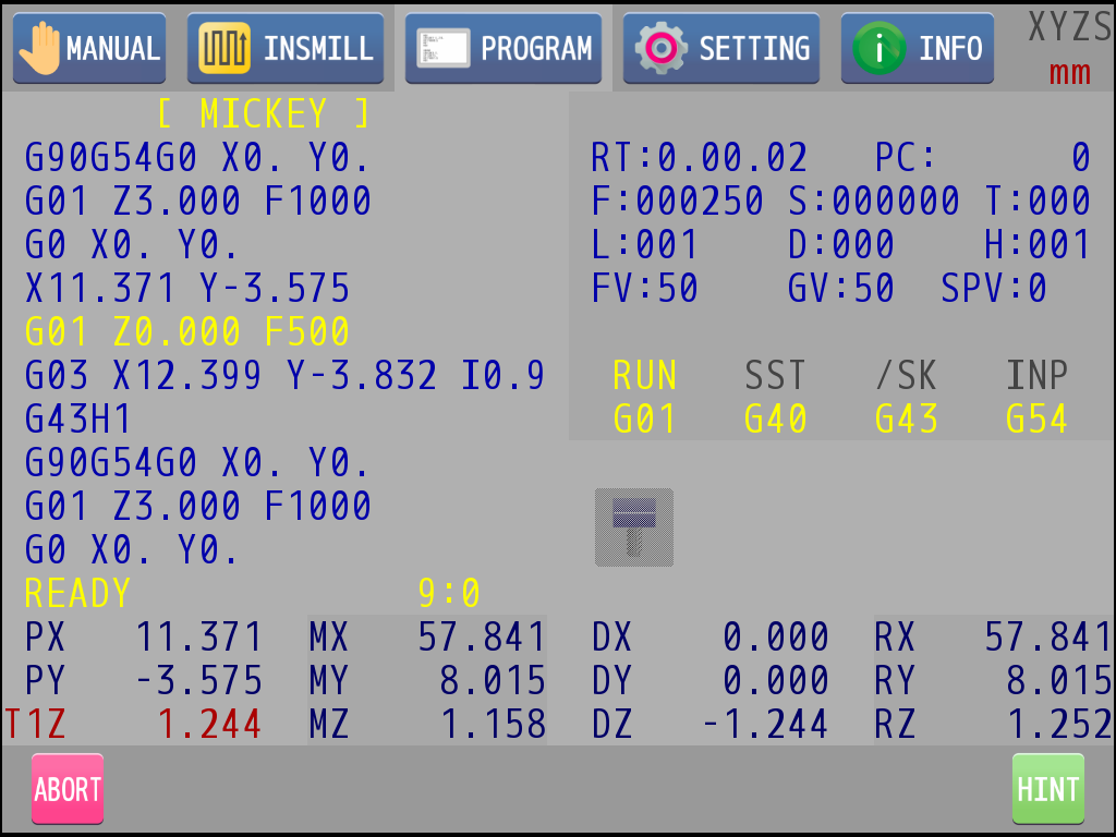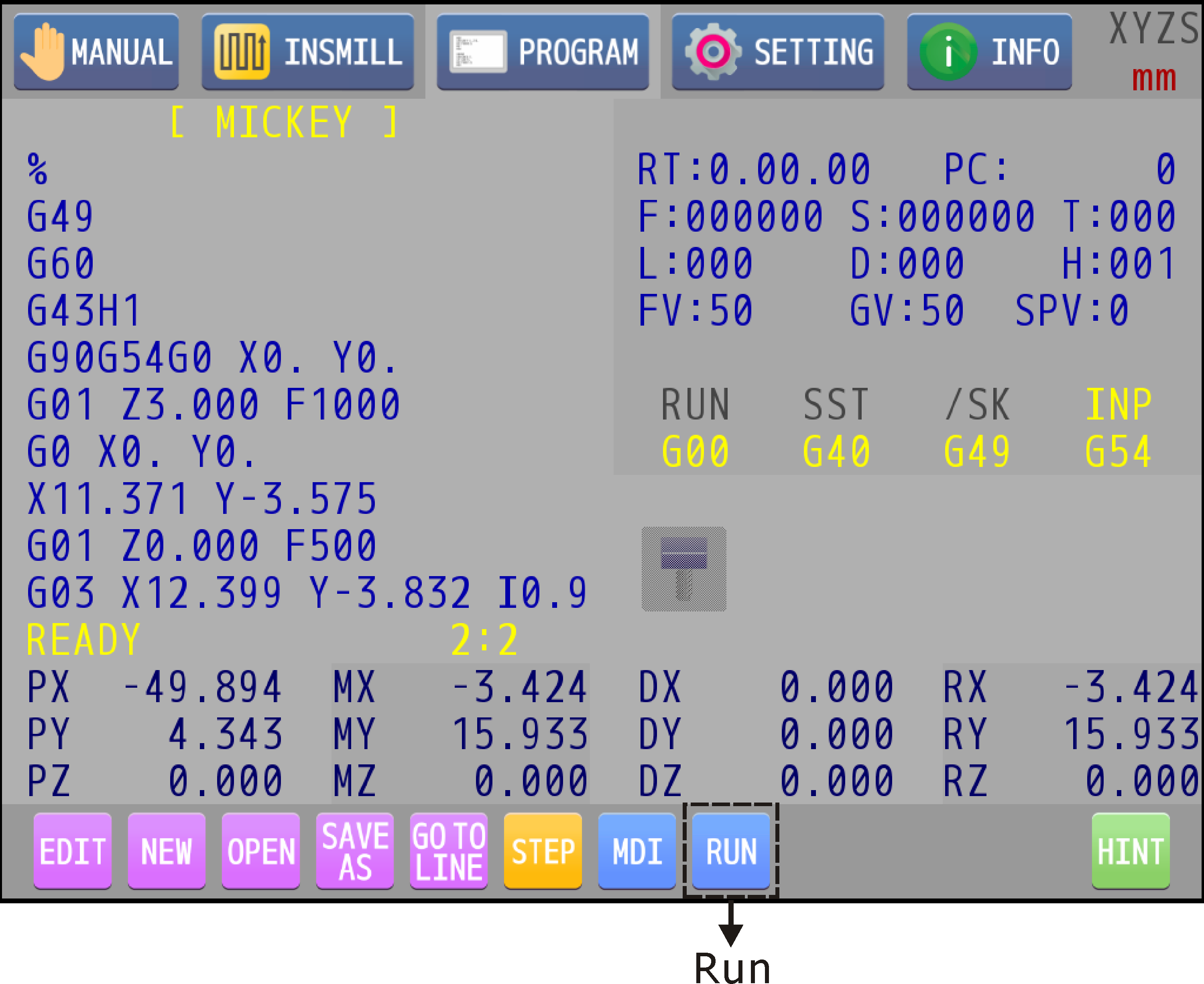 Touch "RUN" button to start the program currently shown in the program display area. |