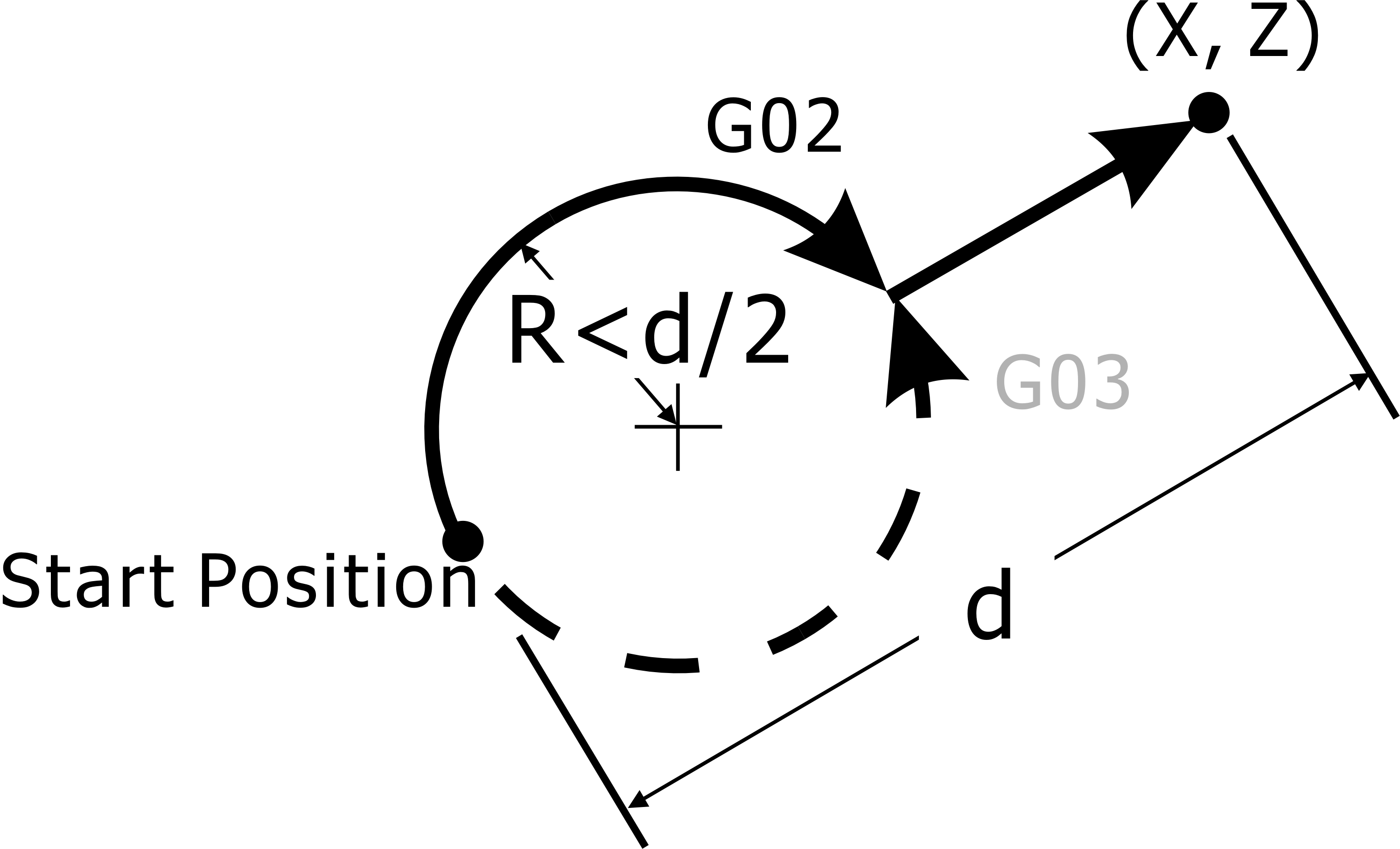 If R = 0: If only X_Y_Z_ is given and R = 0, it will go straight to the destination. If only G02/G03 is given and there is no X_Y_Z_ or R_ value afterwards, no action will be performed.