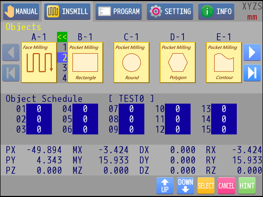 All objects have 4 entities (A-1...A-4). For example, when there is a need for two face milling objects which are difference in size and position, user could apply two different entities of face milling object. The number shown on object list representing the latest edited entity of this object. |