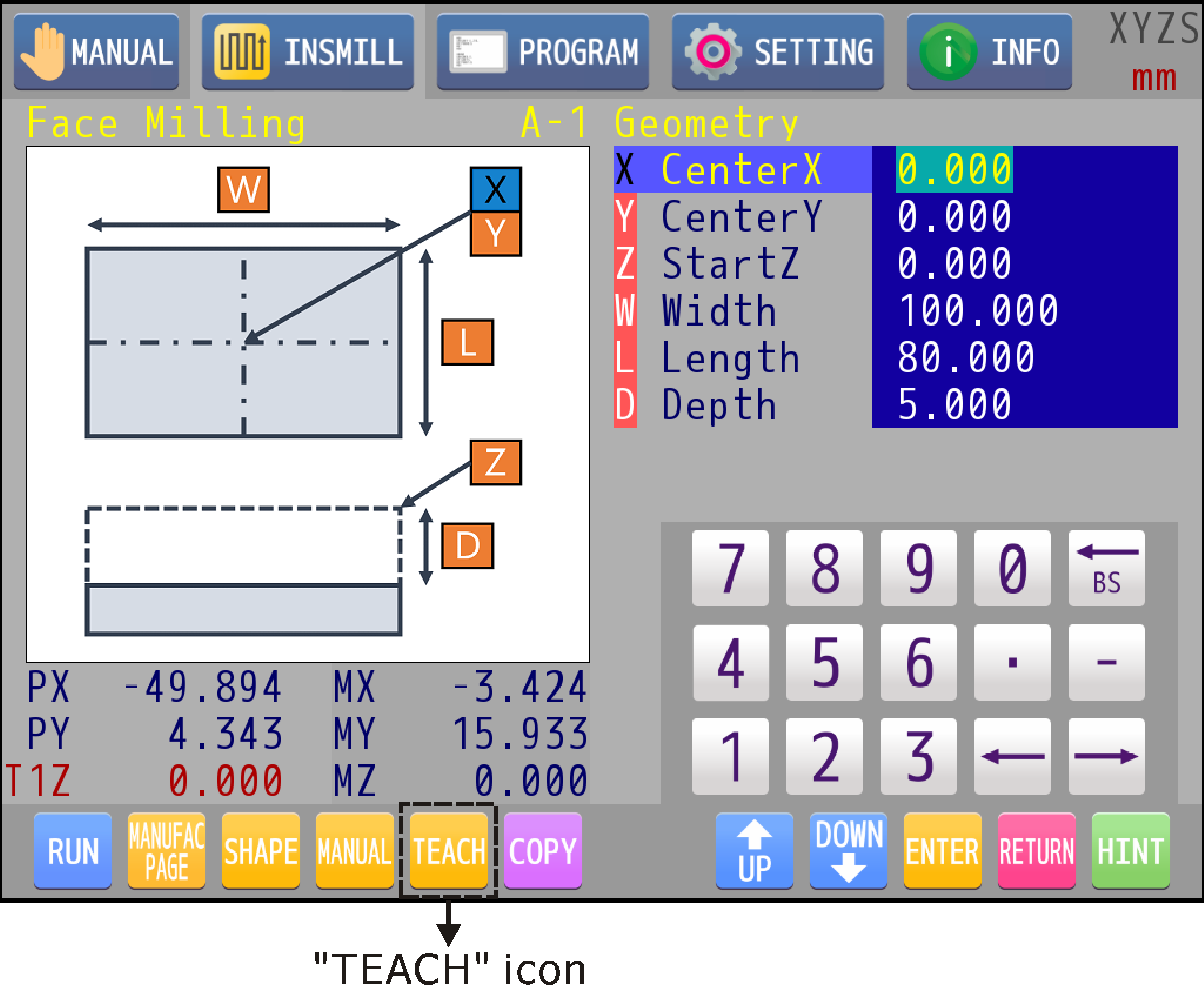 It is usually a combo using of Manual and Teach. Teach can put current program position value into the selecting parameter (the parameters related to the offset, X/Y/Z). Move the axes manually to the position to be taught, select the parameter to be filled in, and touch "TEACH" icon below. Current program position of the chosen axis will fill in the parameter. |