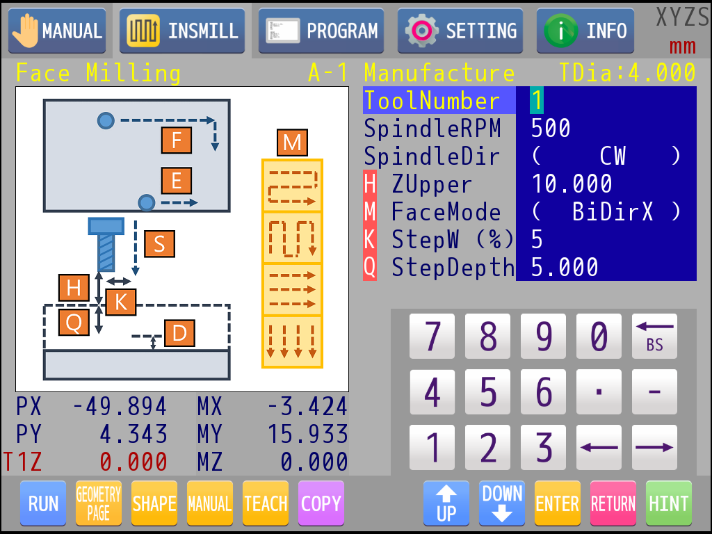 Press the knob to switch edit page between geometry parameters and manufacture parameters. The schematic diagram on the left will also change when switching. In the manufacture page, the tool diameter of currently selected tool number would show on the top of the parameter list. |