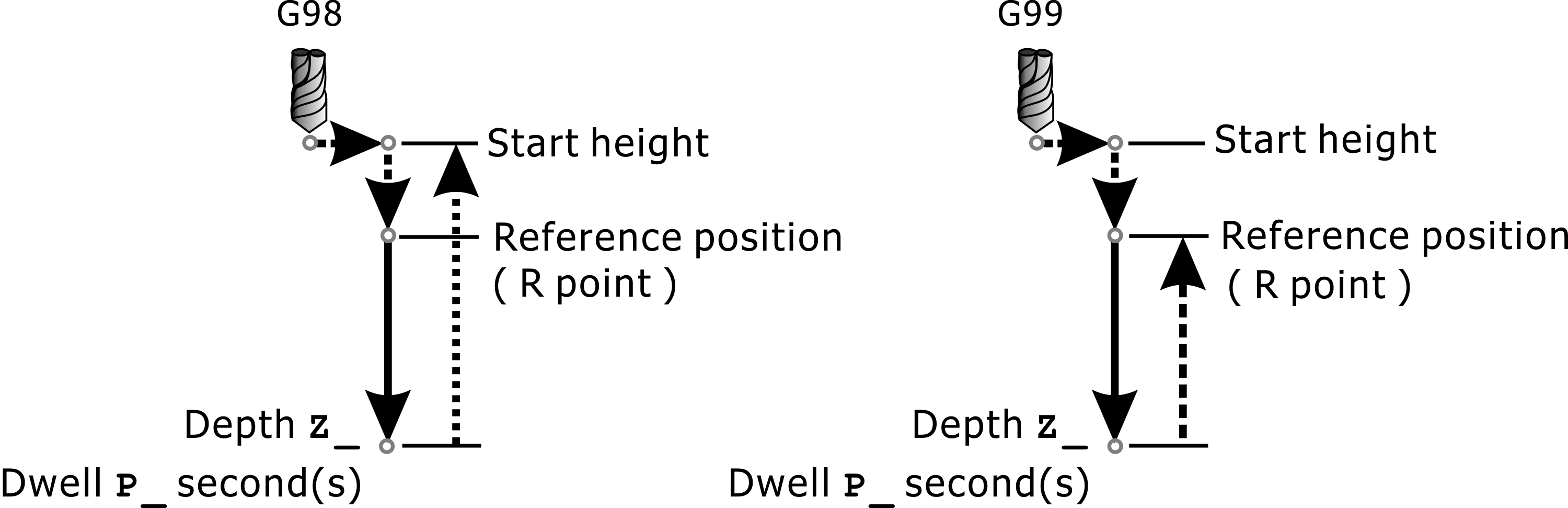 G82 X_Y_Z_R_P_K_F_ ;Drilling cycle with dwell