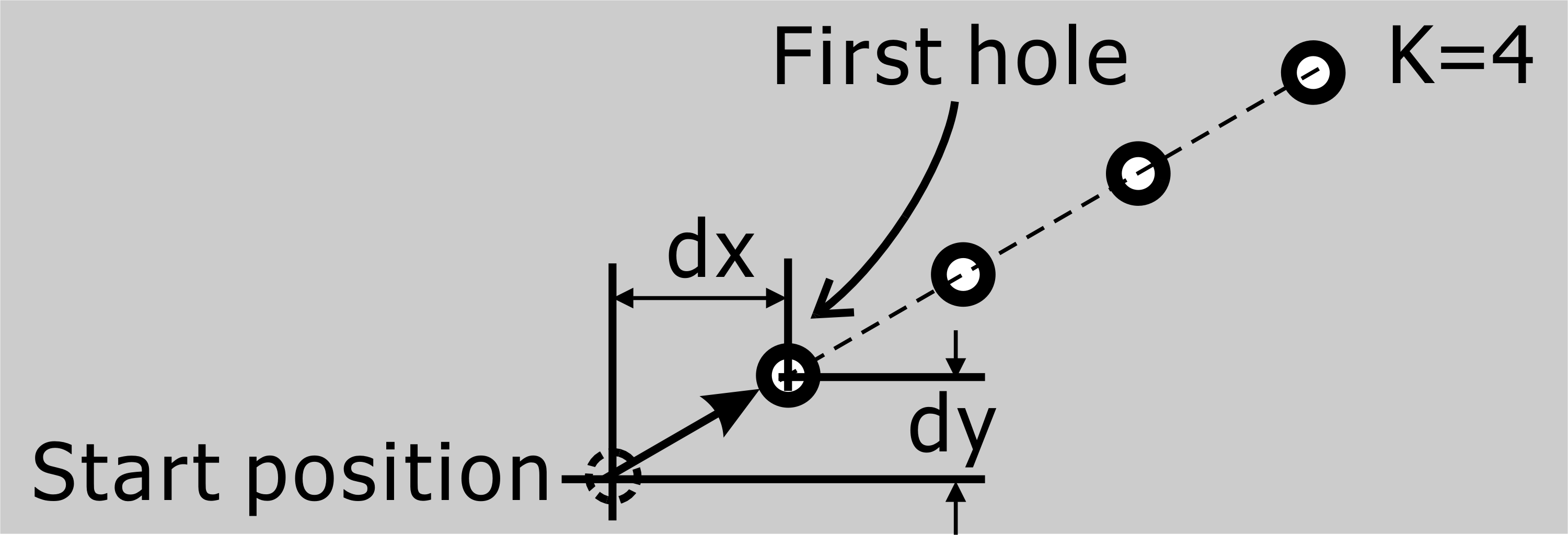 In addition, in the G91 relative incremental coordinate mode, K_ value can be set for all cycle machining instructions, indicating that the cycle command will be repeated along the straight line or oblique line K_ times (for example: repeat drilling), such as "G91 Gxx Xdx Ydy" Z_ R_ F_ Kk;" indicates that the Gxx (G73~G89) cycle machining instruction is repeated for k times, and the distance between the adjacent two holes on the X and Y axes is dx and dy, respectively.