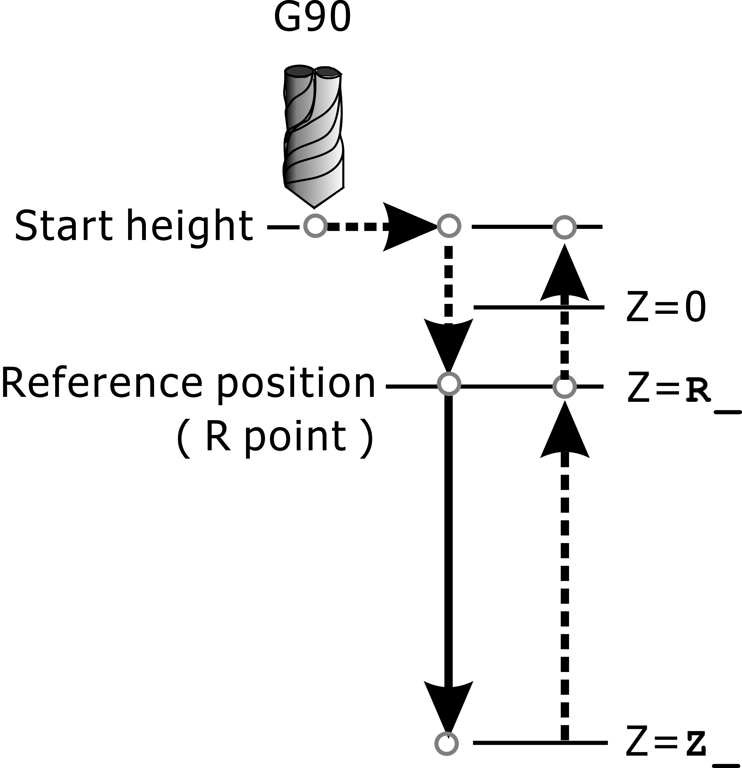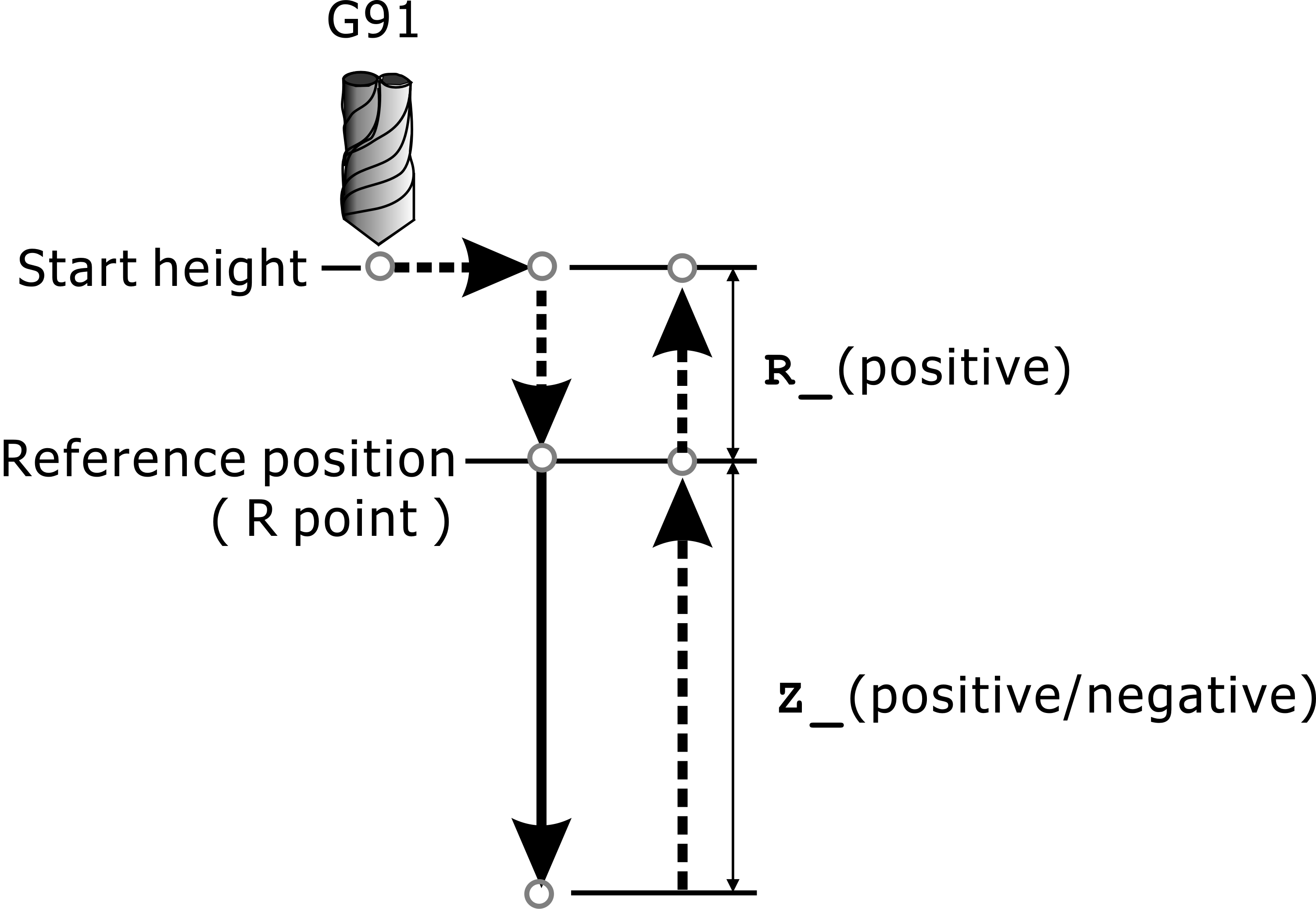 Reference position in the can cycle program command. In G90 absolute coordinate mode, R_ value represents the value of reference position; in G91 relative incremental coordinate mode, R_ value is always positive, representing the original starting height to the reference position. R distance. The machining depth Z value can be defined by G90/G91 respectively: in G90 absolute coordinate mode, Z_ value represents the depth position value; in G91 relative incremental coordinate mode, Z_ value represents the relative position from the reference position R point to the processing depth bottom line Distance, this can be positive or negative. The definitions of the machining cycle instructions in G90/G91 are shown in Figure 1 and Figure 2 below.