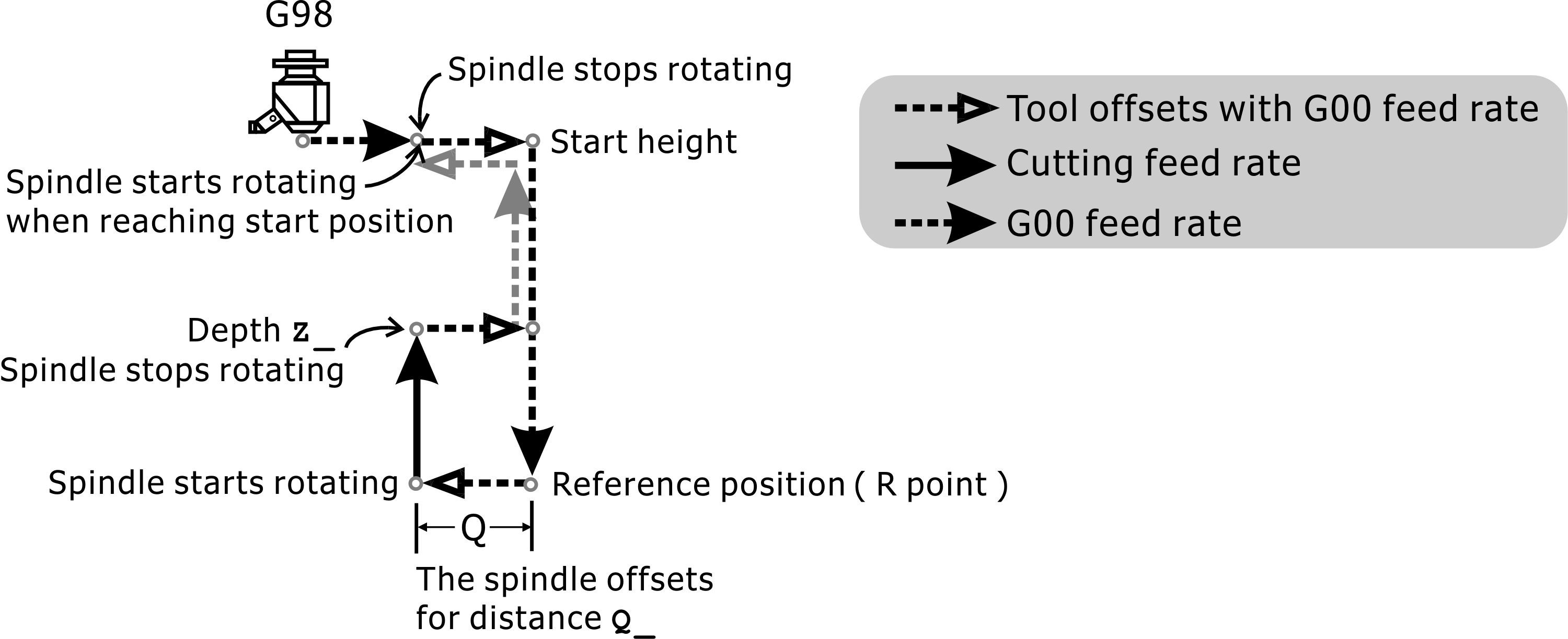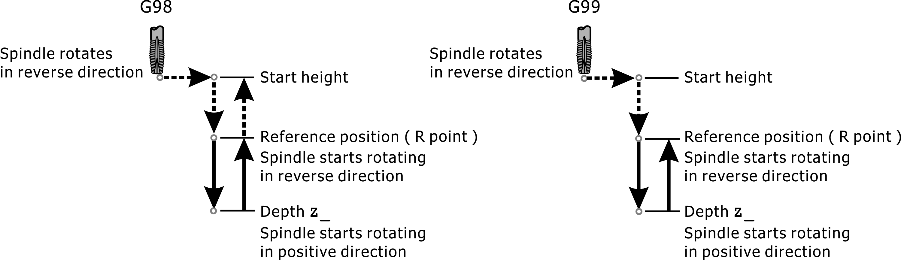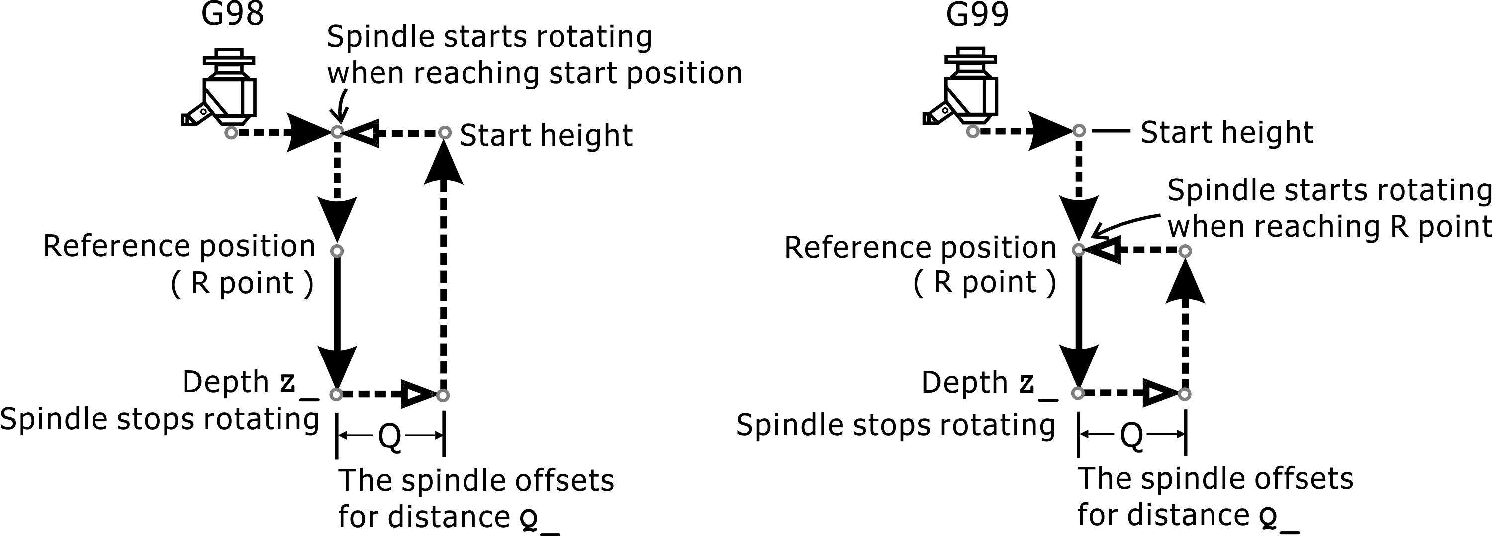 When the G86 command is executed, the spindle will stop rotating after reaching the machining depth Z_, and will return to the original starting height (G98 mode) or the reference position R_ (G99 mode) at G00 speed, and then the spindle will resume clockwise rotation.