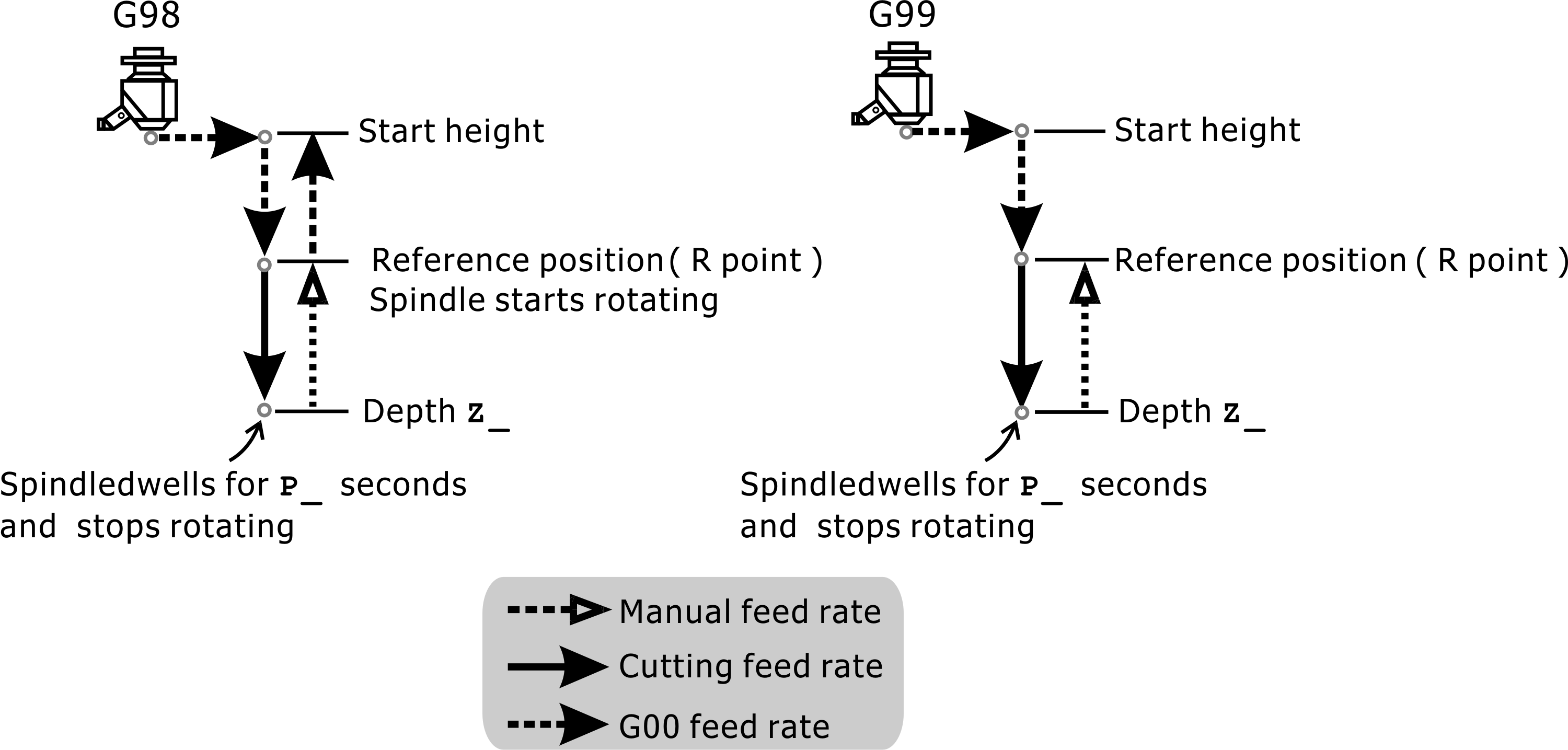 When G89 command is executed, the spindle will feed back to the reference height R_ at the feed speed F_ after machining to the Z_ value depth of the program and dwell for P_ seconds. In this case, if the G98 mode is used, the spindle will quickly go to the original starting height again, otherwise it stops moving.