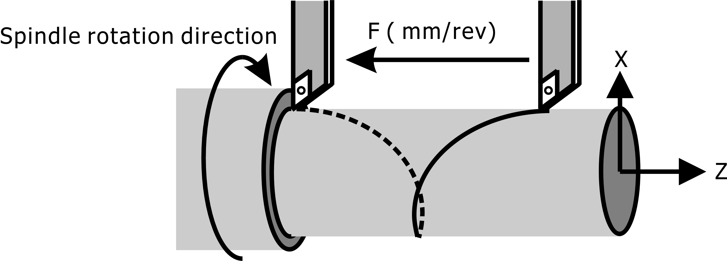 The G95 command setting F_ is the feed speed per revolution. The tool cuts the surface of the workpiece in accordance with the speed at which the spindle moves F_ each time. The G94 command cancels the feed rate control per revolution (ie, G95 mode) and restores the feed rate per minute with F_.